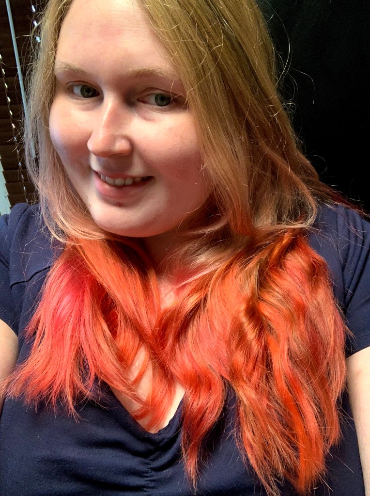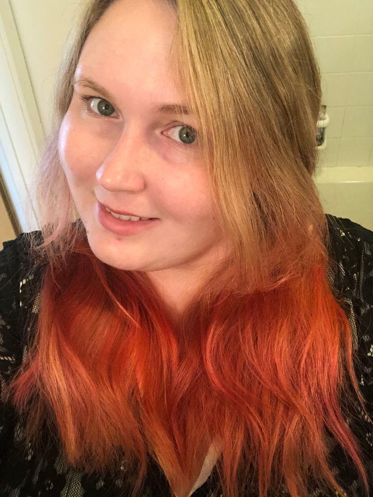 My goal was to make a peach ombre on my naturally blond hair and I accomplished this using Overtone’s rose gold, vibrant red, ginger, magenta, and pastel pink to make a shade I have affectionately named: Princess Peach.