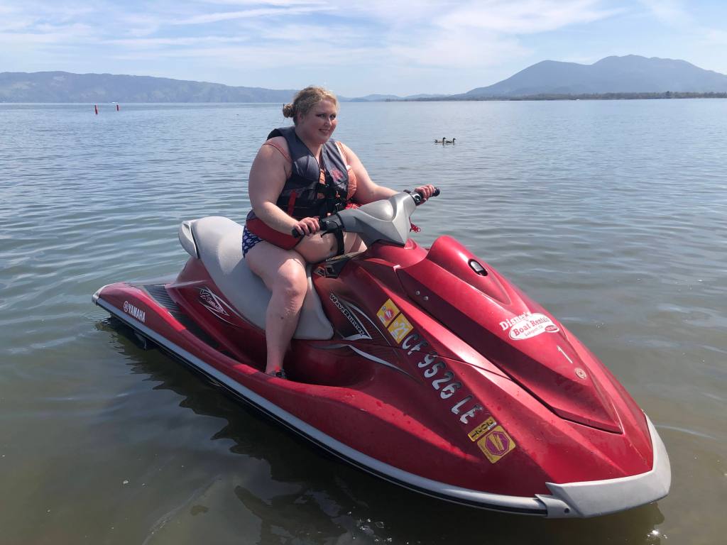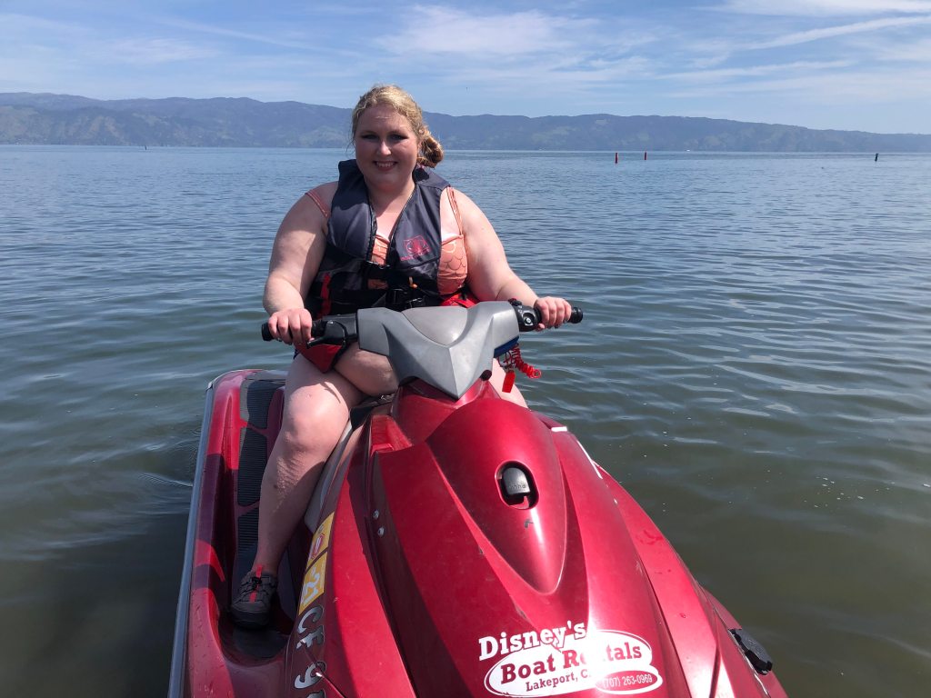 My first new adventure fully vaccinated: jet skiing! This activity does, however, lend itself well to social distancing. My partner and I rented from the Disney rental company in Clearlake and took turns driving the jet ski with one of us in front and the other behind. The controls are very simple. A green button for start (to turn the motor on), a red button to stop (this turns the motor off but a jet ski has no breaks, per se), and a throttle to increase speed.