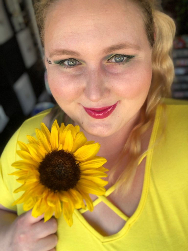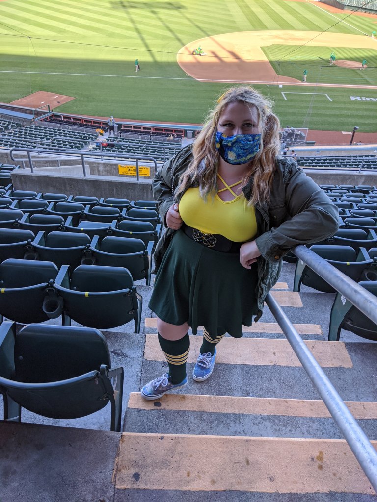 I attended my first ever baseball game post full vaccination and was very excited to create a themed look to support my local team, the Oakland A’s. Their colors are green and gold and I crafted my look around this color combo.
