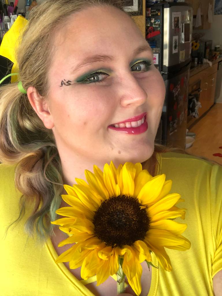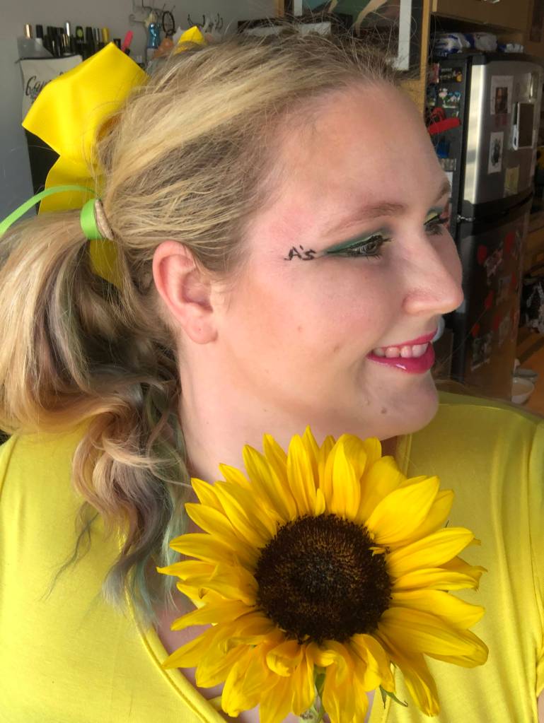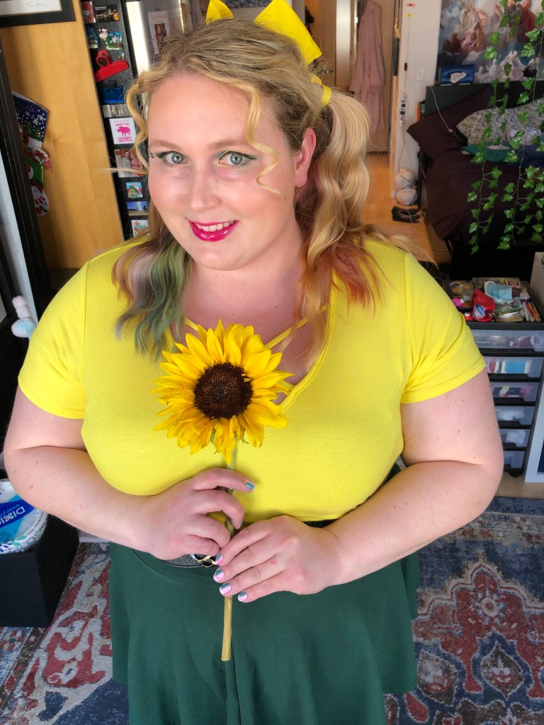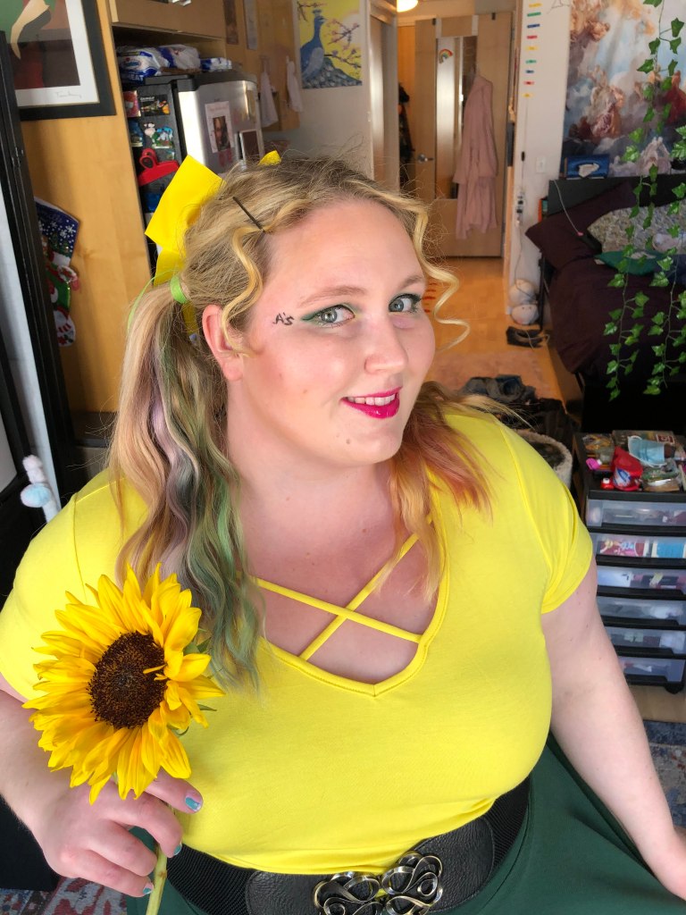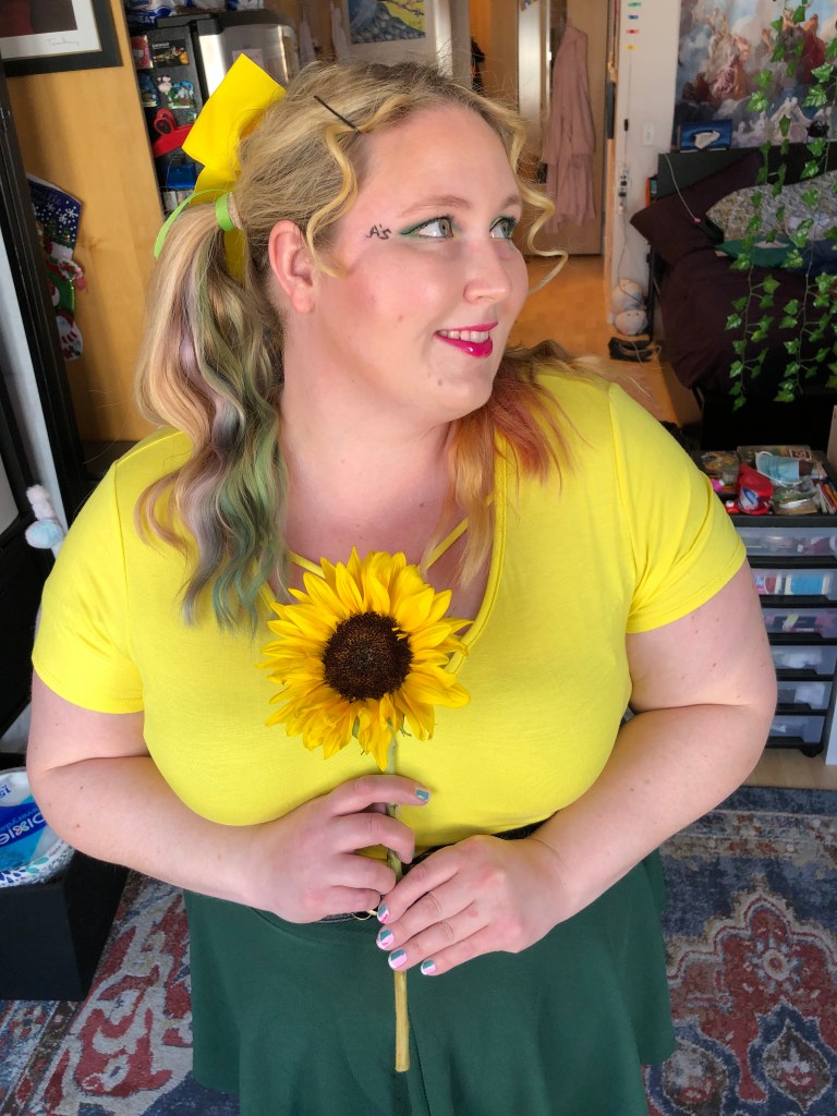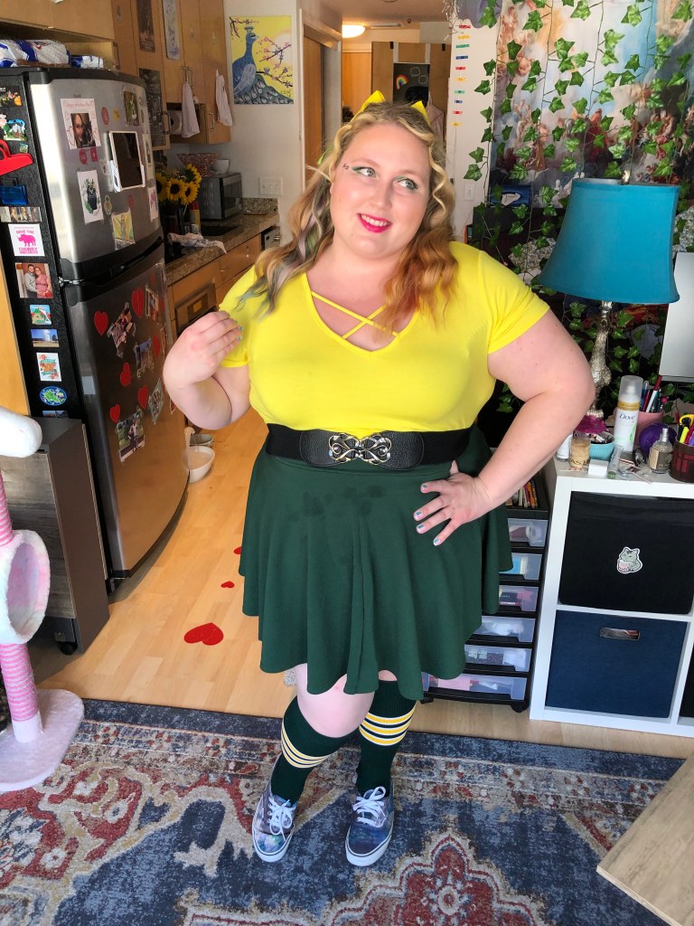Underneath my blond hair I had done a rainbow hair look using Overtone products which I will describe in a future post. For my hair, I split my hair into pigtails which were naturally lightly curled from wearing them in a braid all day. I wrapped one pig tail with a green ribbon and the other with a yellow ribbon. I curled my face-framing layer and added a yellow bow to complete the look. For the ensemble, I went with a fun yellow shirt and green skirt, tied together with a figure-flatting chunky black belt. Oakland A’s green and gold socks completed the look.