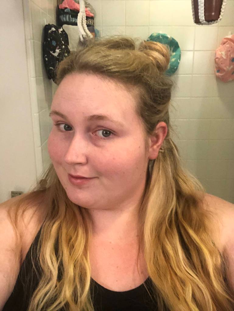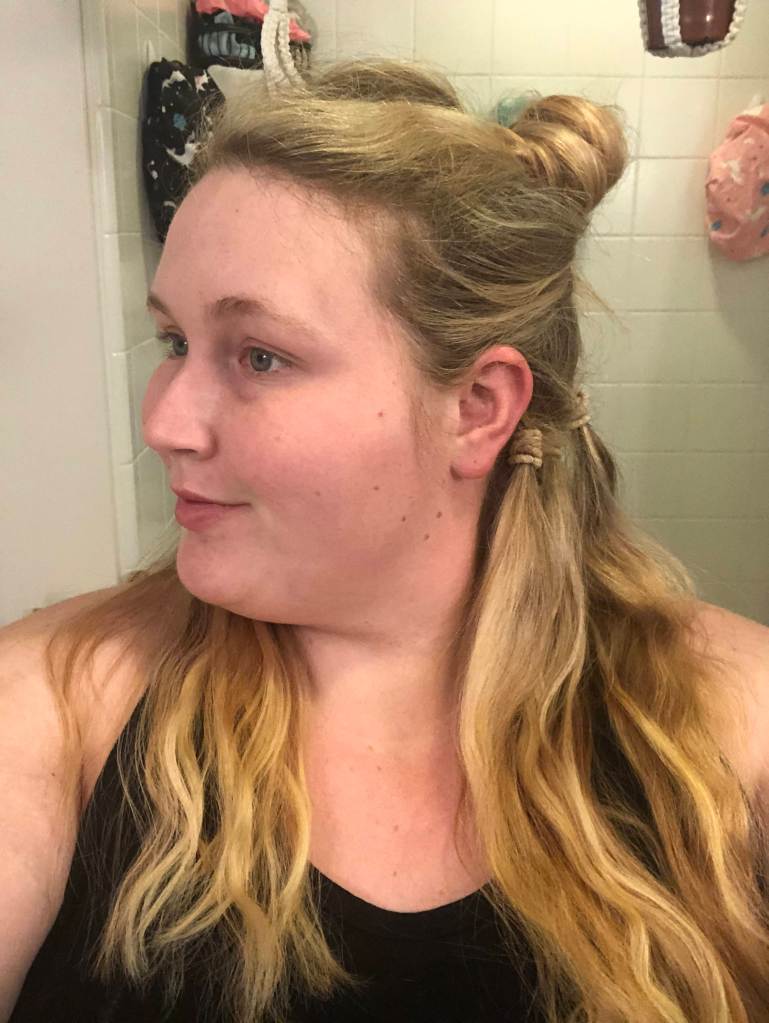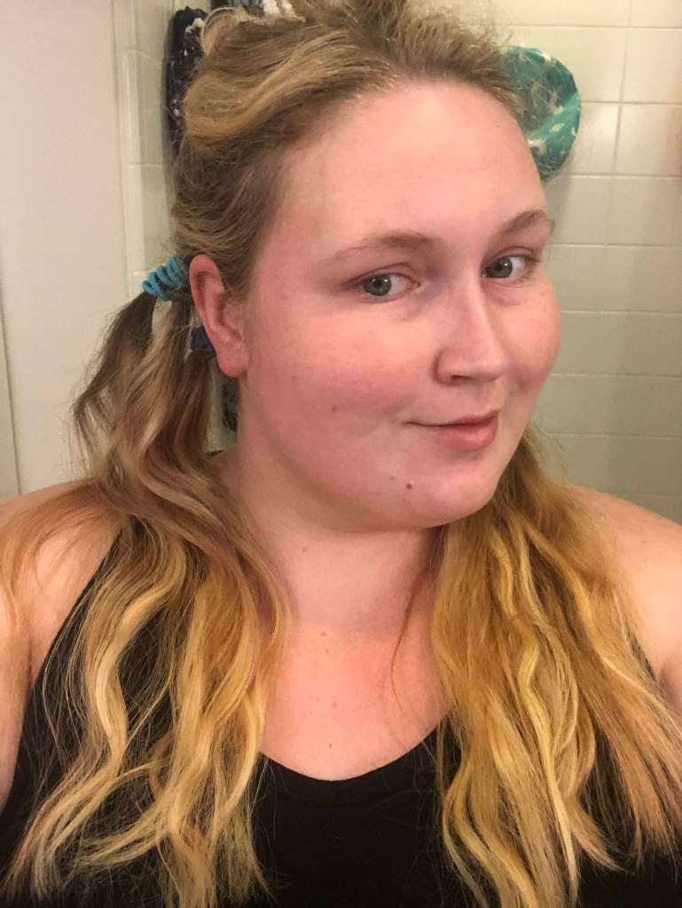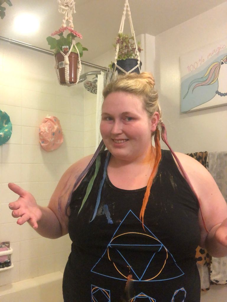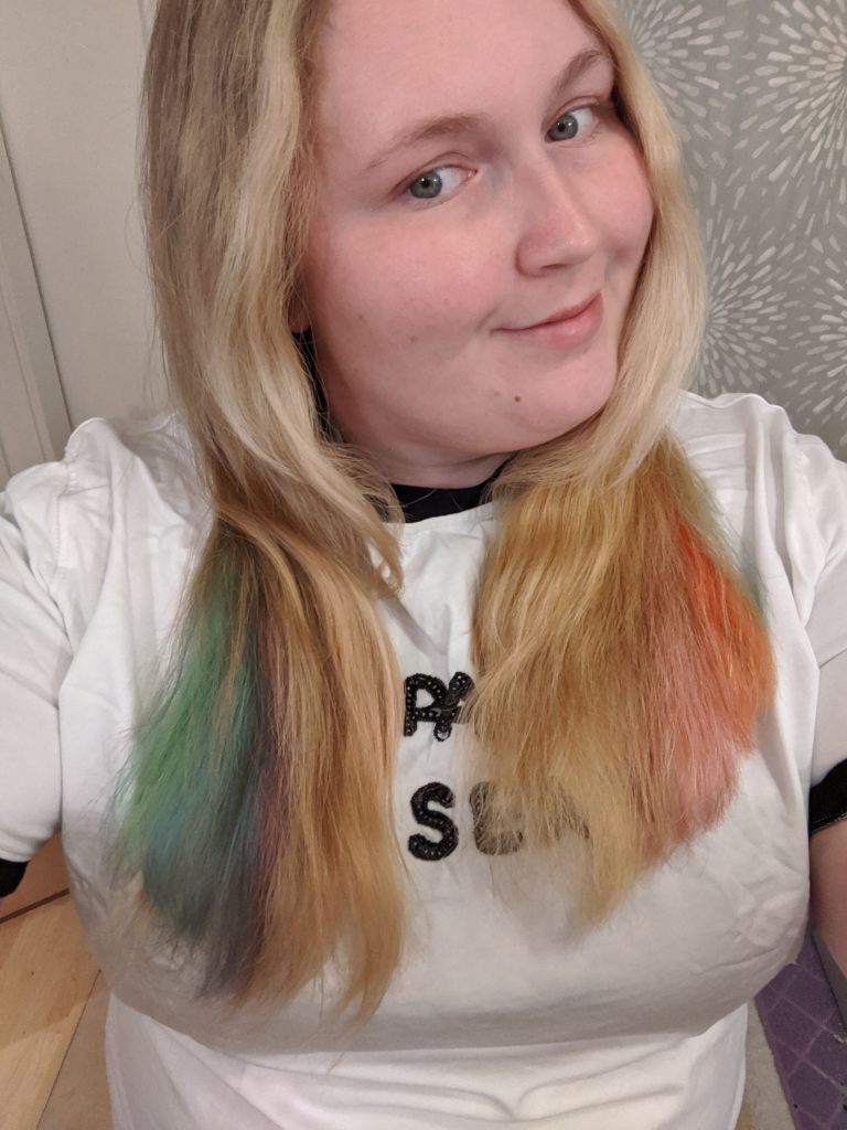 I’ve wanted to try rainbow hair for a while but had been intimidated to go for it. When a friend independently suggested it for my next hair project I was like, yes! I’m in! I really like looks of either the underneath of hair or the tips such that from the front I just look like my natural (well, highlighted) blonde. I achieved this look such that the top of my hair remained blond and the underneath was a vibrant rainbow. To achieve this look I first separated the blond hair I didn’t want dyed by pulling it into a bun on the top of my head. Next I separated each of the six sections for my rainbow by using hair elastics to make six mini ponytails. Since I was doing this solo, this is the best way I could think of to separate the colors so they didn’t get mixed/muddied. Since I was doing the underneath of my hair I wasn’t too concerned about missing the root section when the hair elastics were sitting since that area wouldn’t be very visible anyway.