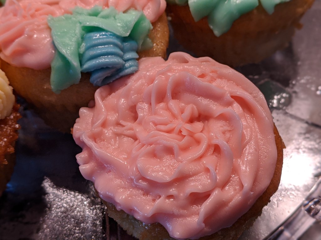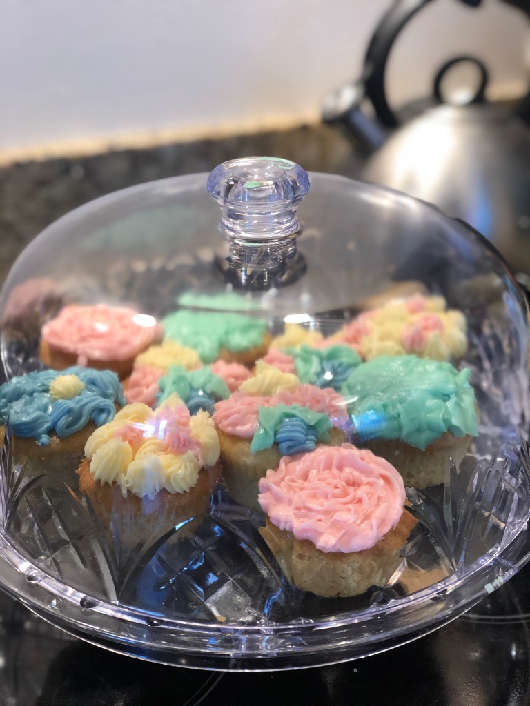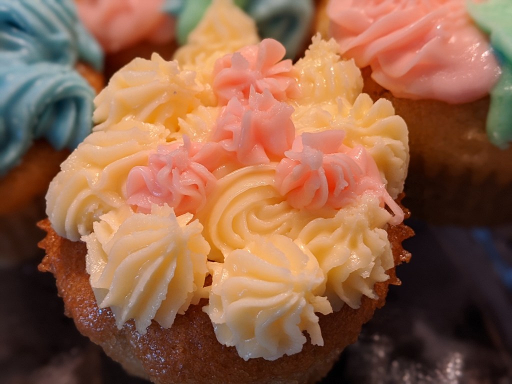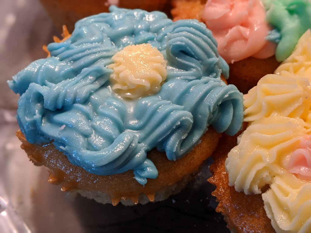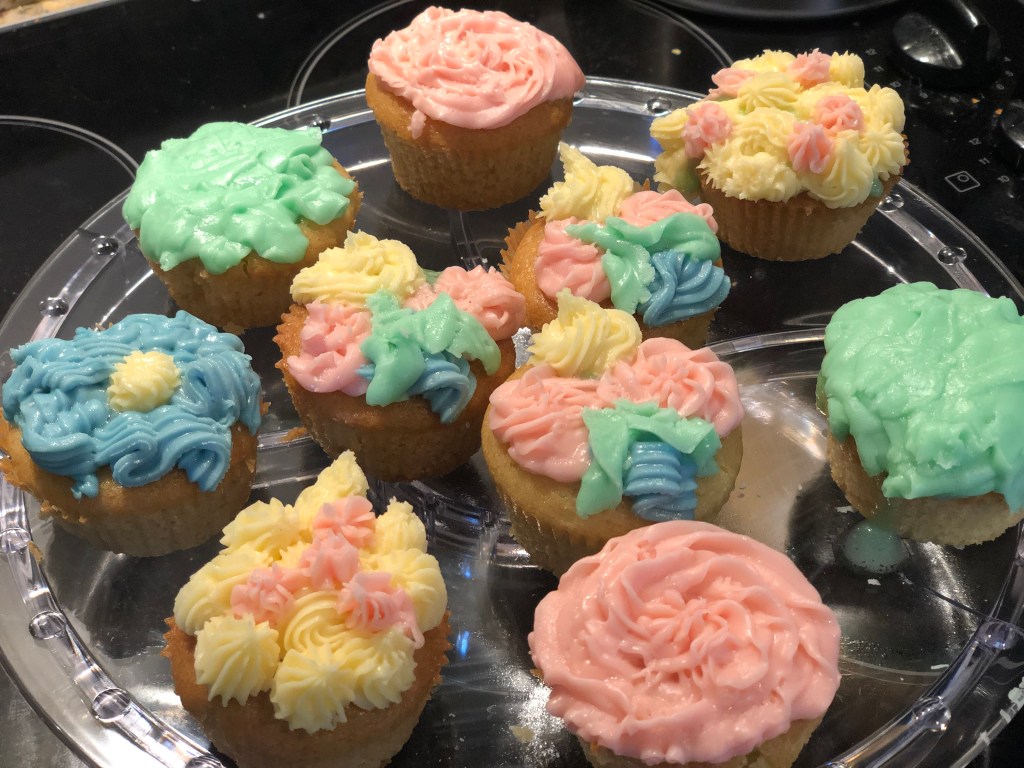 I made the pink roses by using the fewer pronged floral tip and swirling around the cupcake, starting at the outside of the cupcake and working inward. I made the yellow and pink bouquet by first dotting with the yellow many pronged floral tip and then filling in spaces with the fewer pronged pink tip. The blue flower I made in a wave-like motion, moving the tip left to right while going clockwise around the cupcake. I finished it off with a yellow dot in the center. The multicolored bouquets were made by putting all of these techniques together: green leaves made by piping straight outward, pink roses made by swirling, yellow flowers made by dotting, and a blue flower made with a wave-like motion. I’m very pleased with how these lovely Mother’s Day-inspired frosting flowers turned out and am excited for future opportunities to make beautiful cupcakes.