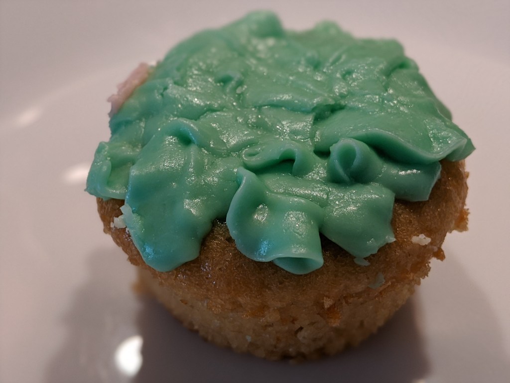 I assembled my piping bags by cutting off the tip of the decorating bags, slipping my metal tip of choice through and finally securing it with green electrical tape (as seen in the example above). The tape may have been superfluous but I just wanted to make sure that my setup wouldn’t leak. I used the left flat tip (left) for green leaves, the smaller (or fewer pronged, center left) floral tip for roses, the larger (or many pronged, center right) tip for yellow flowers, and the Christmas tree-looking tip (right) for blue flower. I first allowed the cupcakes filled with curd to cool. Initially, they were still a bit warm and my lovely green succulent design melted a bit. I learned my lesson and allowed them to cool for longer before attempting my flower designs.