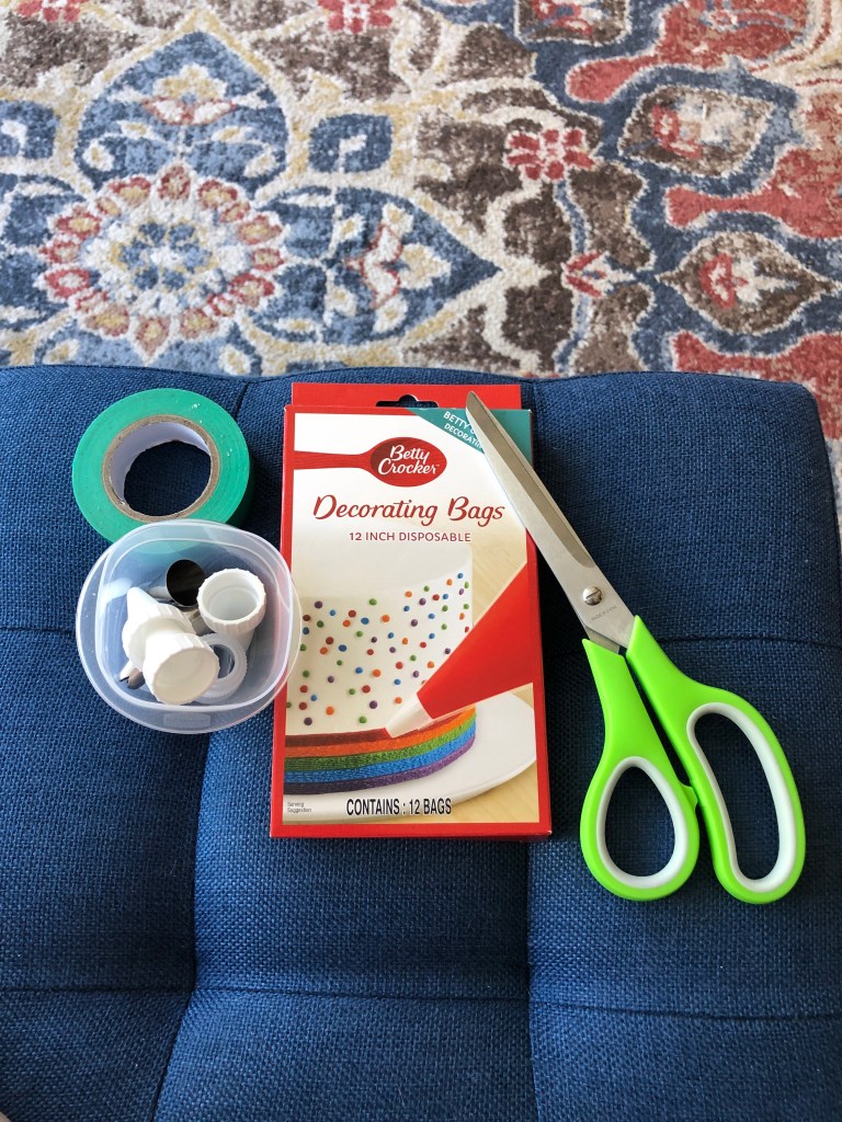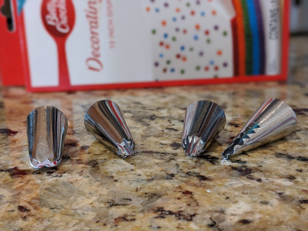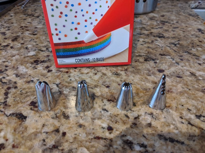 Mother’s Day is coming up (May 9) and because I live far away from my mom I was excited to focus on the aesthetics of some fun floral cupcakes. These citrus forward cupcakes are key lime cupcakes with a coconut-lime curd and a lemon-lime frosting. For this post, I will focus exclusively on the piping work. Although I love pretty baked goods, I don’t have a lot of piping experience and wanted to learn more about different types of tips, piping bag options, and how to put everything together to make beautiful designs. My tools were: a variety of tips I have acquired from the baking section of Safeway over the years, Betty Crocker Decorating bags, scissors, and electrical tape.