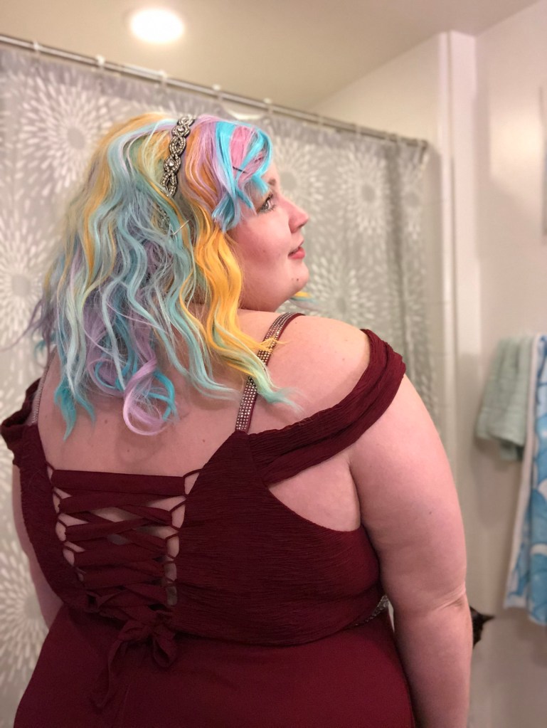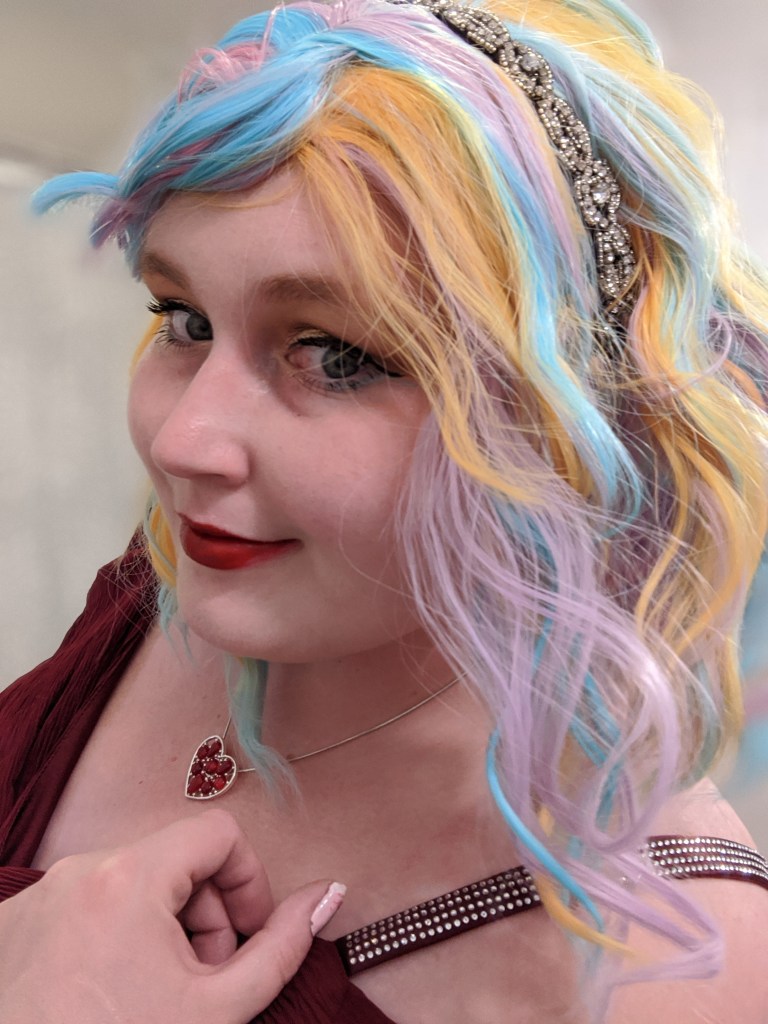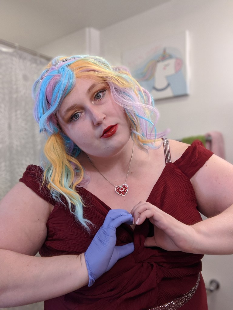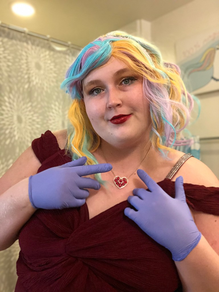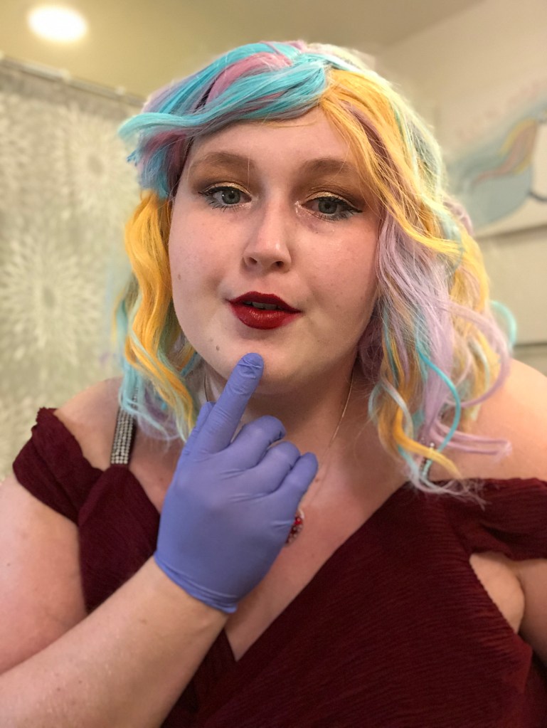 My makeup look for the evening was loosely based on Jaclyn Hill’s Old Hollywood Glam makeup tutorial but with a champagne/gold color on the lid instead of a bright white color. I also added a teal liner to my lower lash line to give the look a pop of color. My lip color of choice was, appropriately, So Marilyn by Charlotte Tilbury. My rainbow Promising Young Woman wig was from Amazon. I thought the colors of the wig were perfect but didn’t like the center part so I cut side bangs into the wig and used bobby pins to hold them in place for the final look. I accessorized with some nitrile gloves, a sparkly art deco headband, and a heart necklace to match the style from the movie. My red carpet ready floor length gown featured a deep V-neck look and rhinestone accents. I hope even classic red carpet fashion critic Joan Rivers would have approved of this beguiling look.