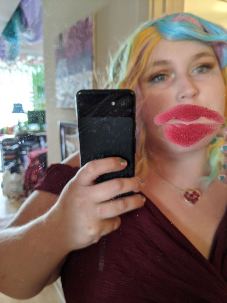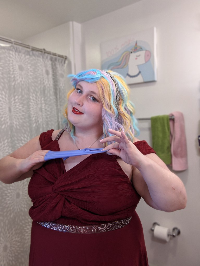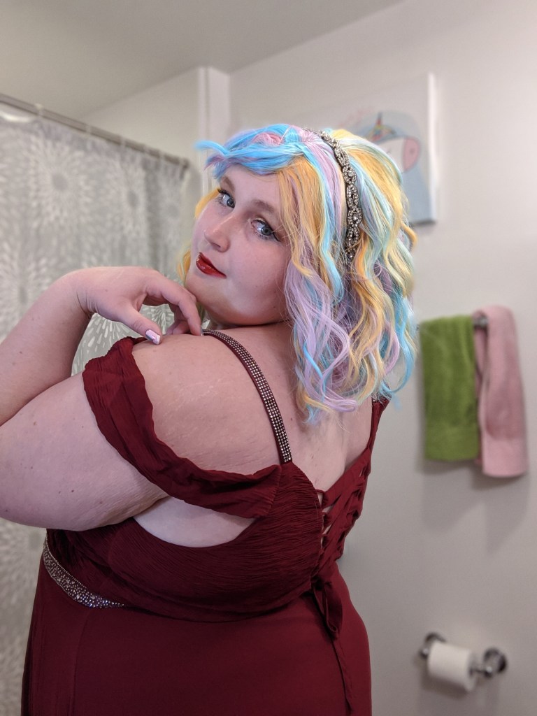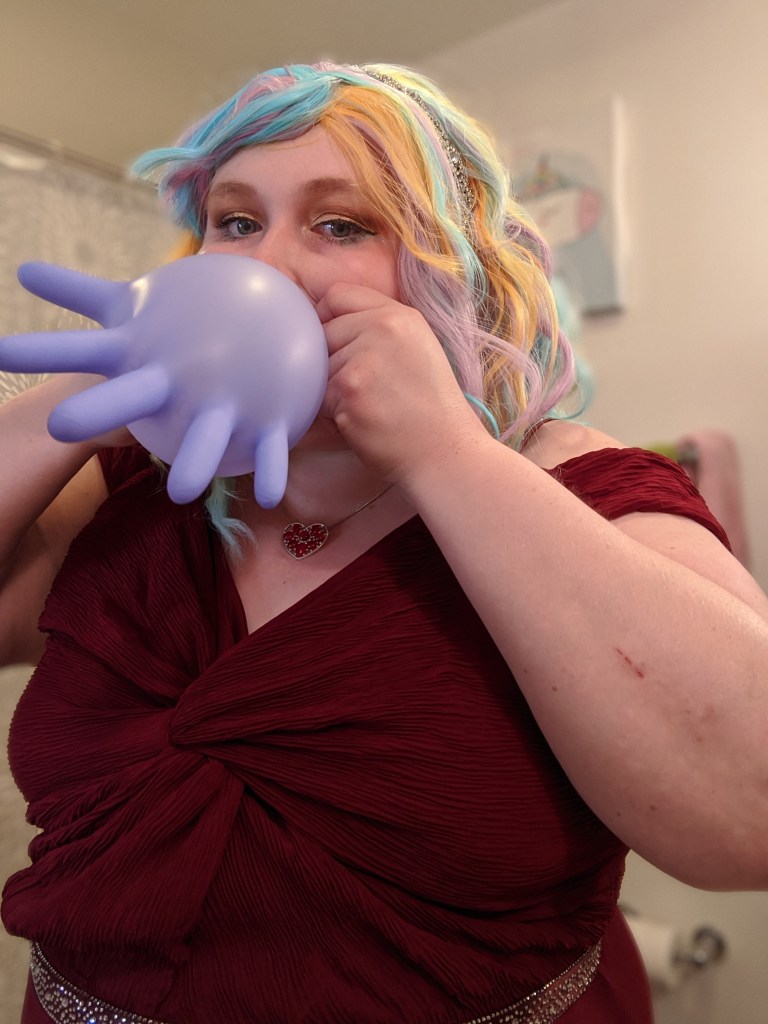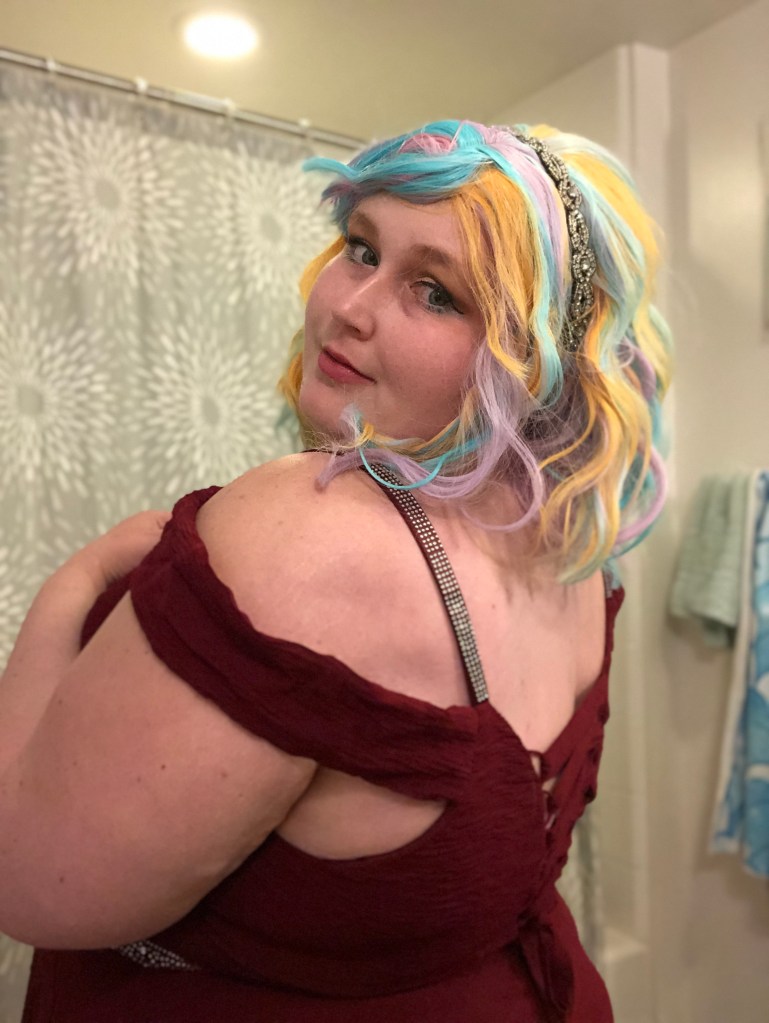 My makeup look for the evening was loosely based on Jaclyn Hill’s Old Hollywood Glam makeup tutorial but with a champagne/gold color on the lid instead of a bright white color. I also added a teal liner to my lower lash line to give the look a pop of color. My lip color of choice was, appropriately, So Marilyn by Charlotte Tilbury. My rainbow Promising Young Woman wig was from Amazon. I thought the colors of the wig were perfect but didn’t like the center part so I cut side bangs into the wig and used bobby pins to hold them in place for the final look. I accessorized with some nitrile gloves, a sparkly art deco headband, and a heart necklace to match the style from the movie. My red carpet ready floor length gown featured a deep V-neck look and rhinestone accents. I hope even classic red carpet fashion critic Joan Rivers would have approved of this beguiling look.