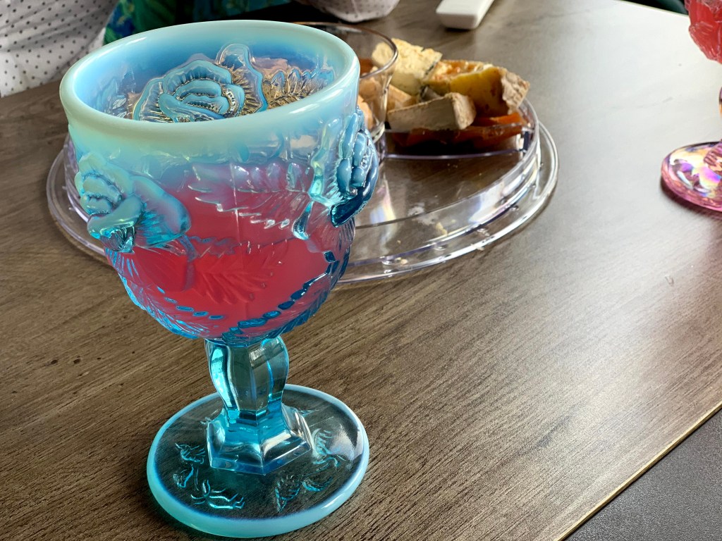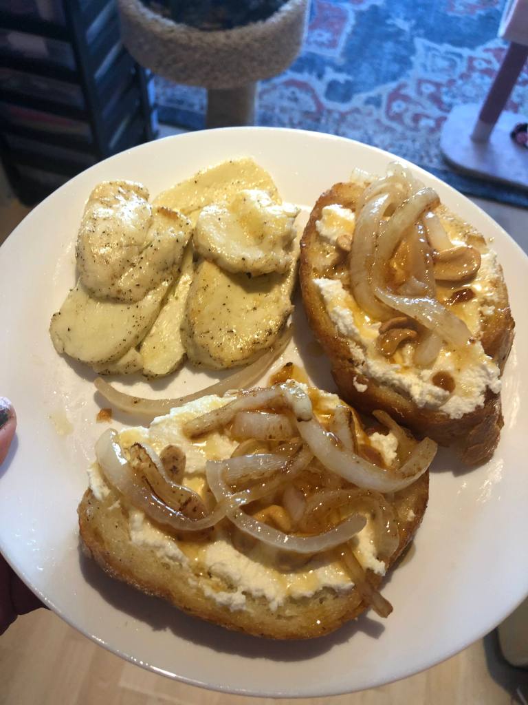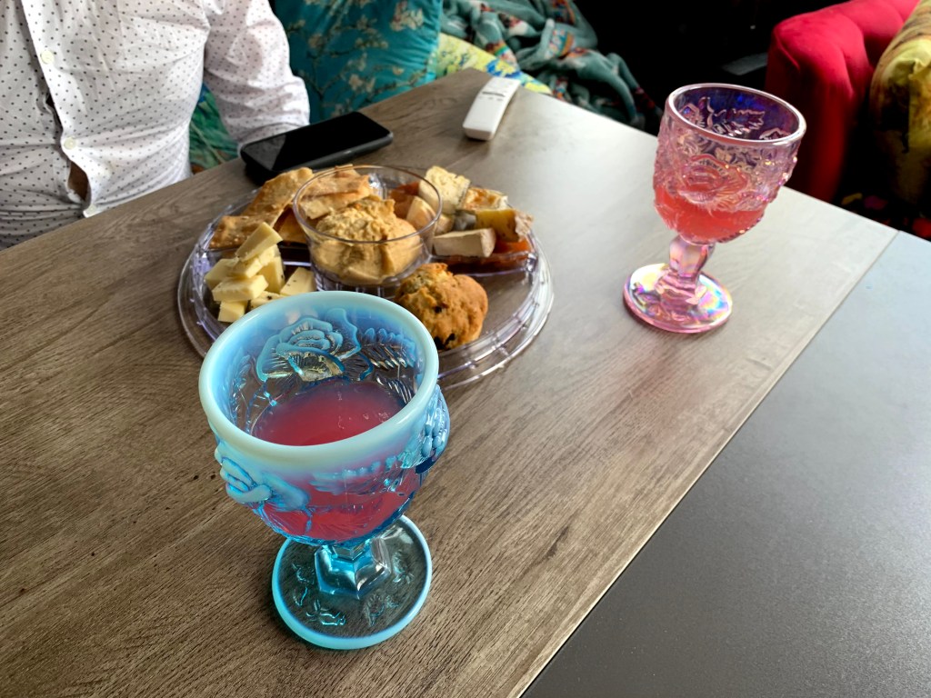 I also had a lot of fun with drinks and appetizers for our Oscar viewing party. Premade bright pink Cosmos were served in chalices from the Madonna Inn. Appetizers included fried halloumi cheese, baguette slices with ricotta, caramelized onions, cashews, and honey, hot movie theater buttered popcorn, and various cheeses and spreads.