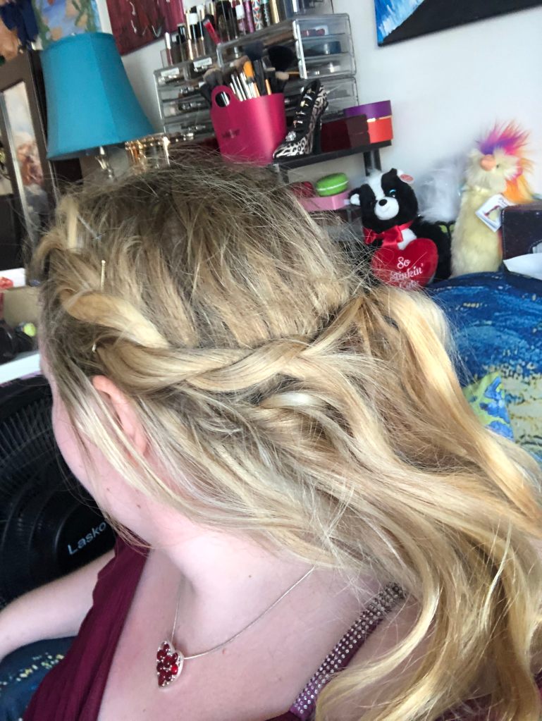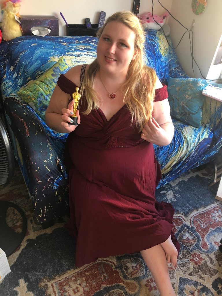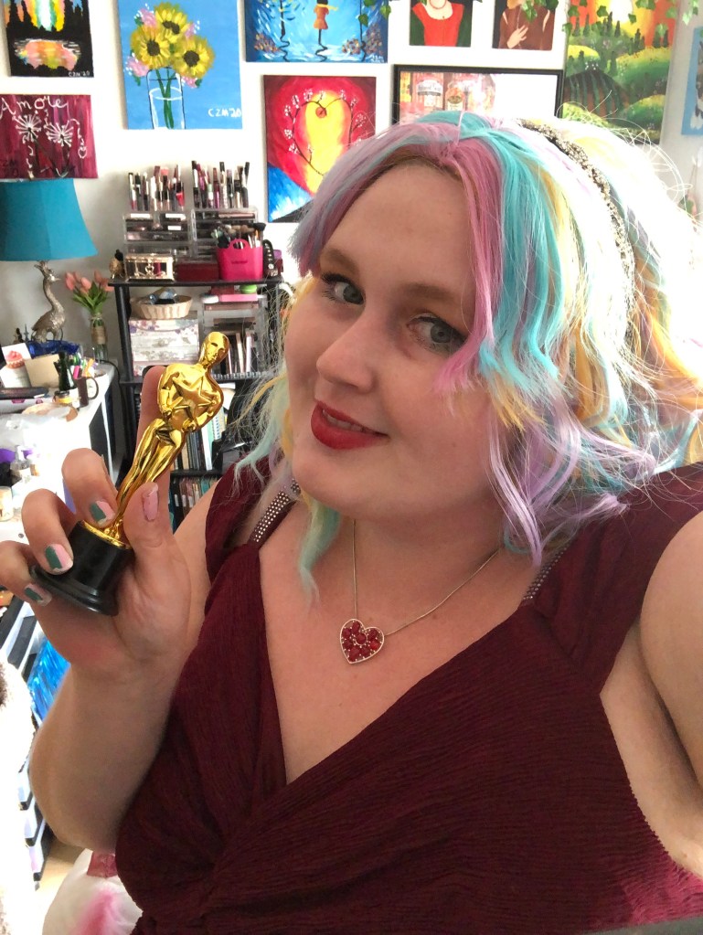 Inexplicably, even though I knew I would be wearing a wig for the evening, I did a fancy hairstyle underneath my wig which consisted of rope braids connected in the back of my hair to form a crown. A tiny fake Oscar award completed the ambiance. I had a ton of fun crafting this look and enjoying the glamour of the academy awards from the comfort of my couch.