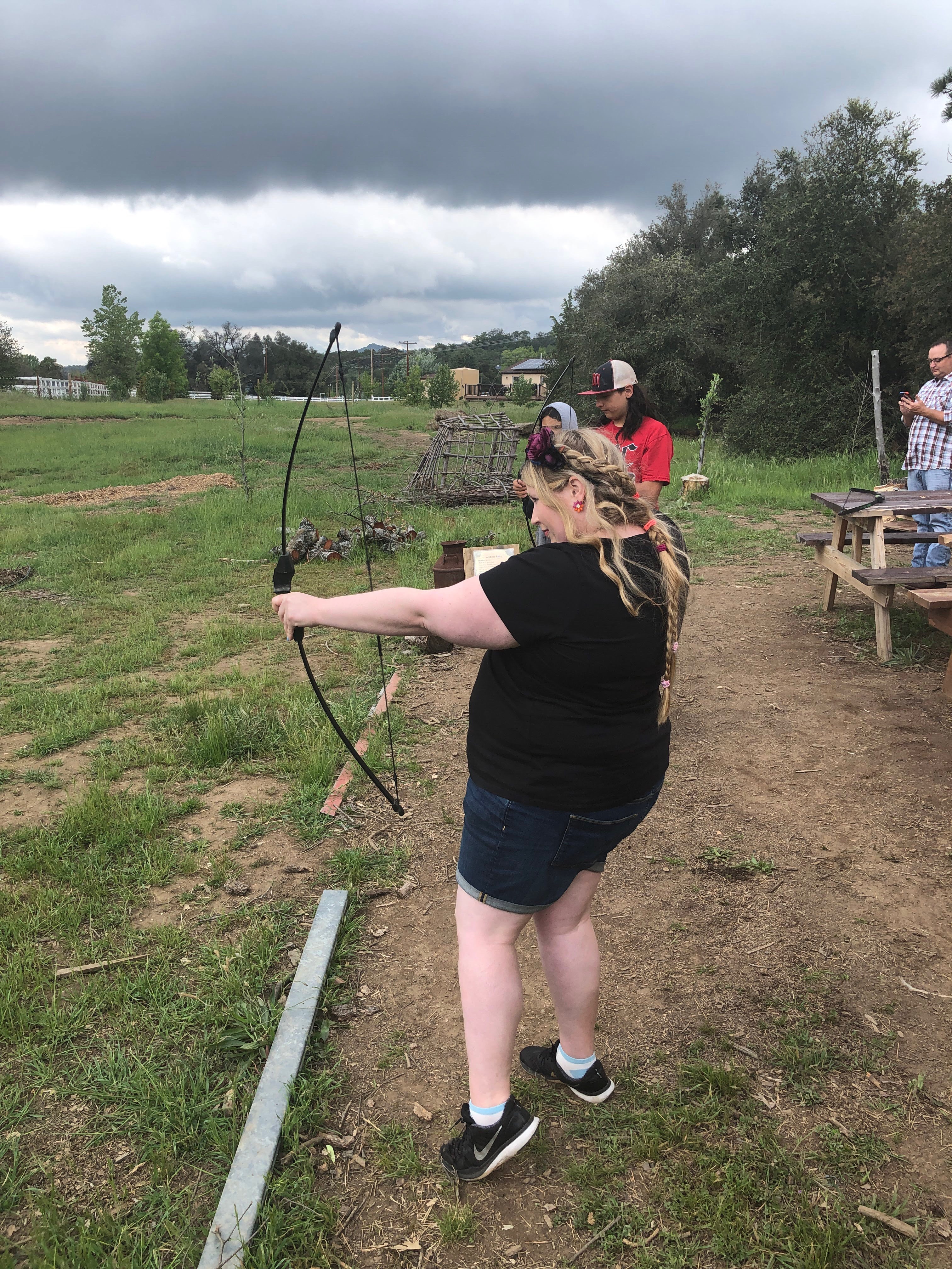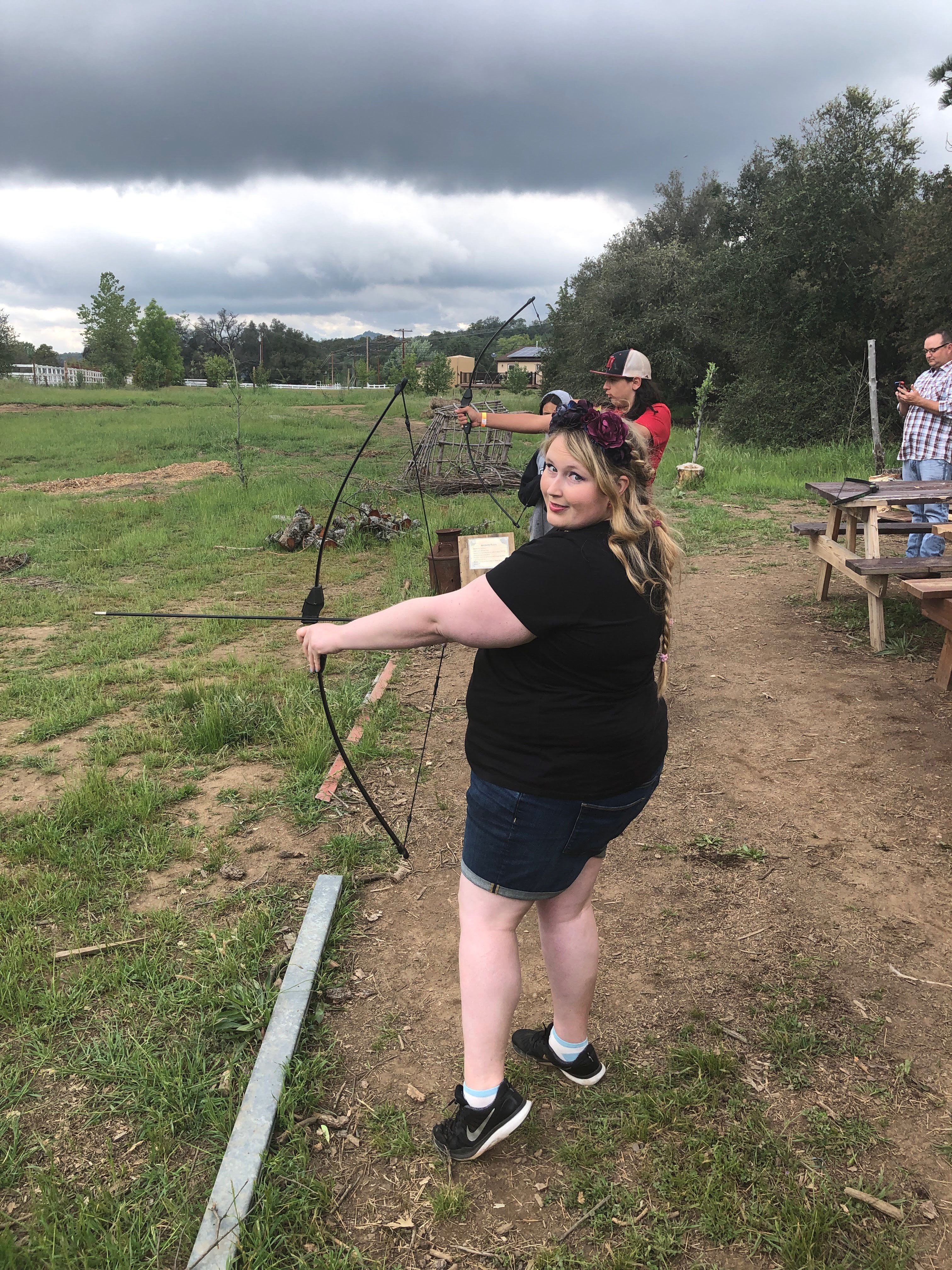 Next in my trying new things series: archery! I tried archery for the first time a few years ago and have come back to it here and there at Renaissance Faires and similar events over the years. Archery is a ton of fun. I’d say it’s one of those things that’s easy to learn the basics but hard to master in my experience. An archery lesson often starts with identifying your dominant arm, which for me is my right arm. The key items involved in archery are: a bow (right handed or left handed), arrows, a quiver to hold the arrows, a target, and often an arm guard (to protect you when the string of the bow snaps back).
