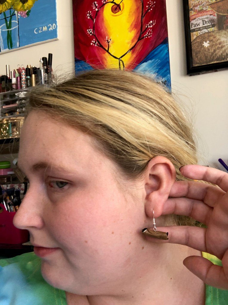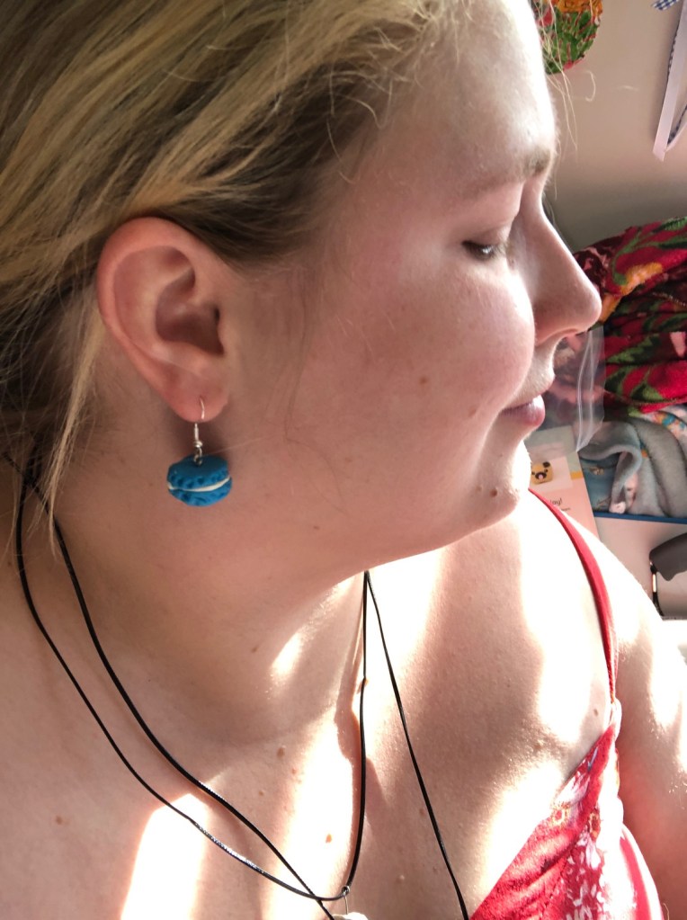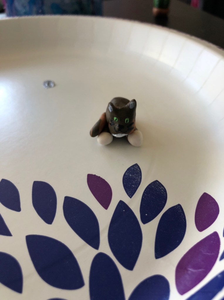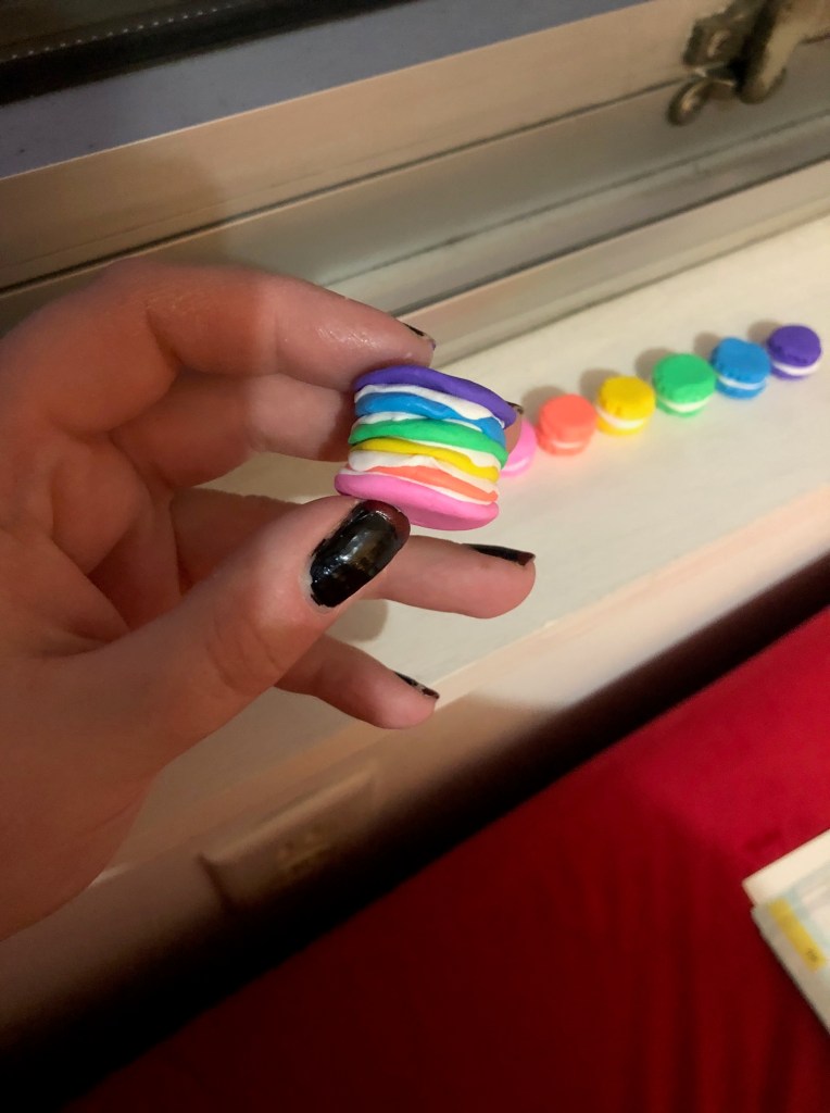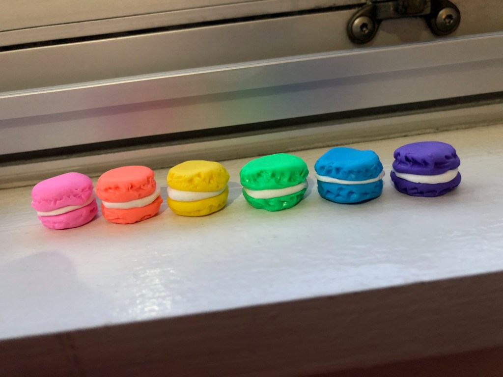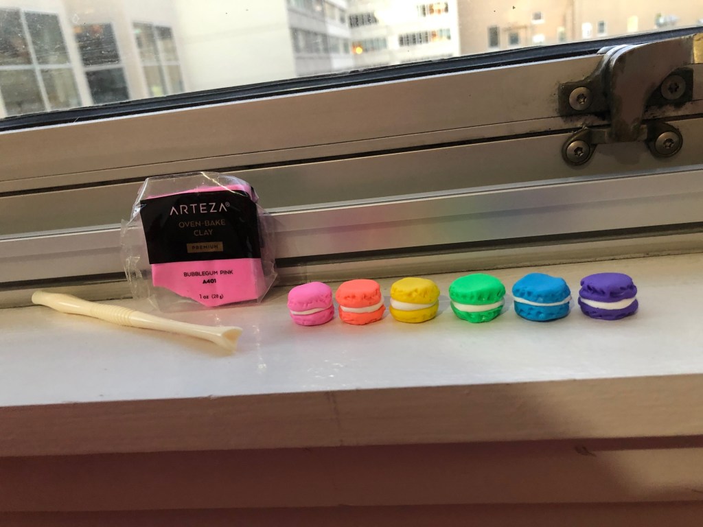 My most recent crafting hobby is sculpting jewelry and figurines out of oven bake clay. I got started with this hobby with an oven bake clay set in a variety of colors (that also came with some basic tools for shaping clay) and a book on sculpting clay for beginners that focuses on the fundamentals and then uses subjects that I really liked such as desserts and cute animals to demonstrate how to sculpt clay. I started by making a rainbow assortment of macaron earrings. To accomplish this, I made two discs of each color and shaped the “feet” detailing of the macrons using a needle tool. I then used white clay to make the cream filling, rolling it first into a ball before flattening it into a disc to place between the two macaron halves. I then inserted a metal loop into each macaron that would eventually be used to connect to earring backings. I baked the macrons at 325F for 15 minutes on a metal surface (as per the clay package instructions) and allowed them to cool completely before adding earring backings.