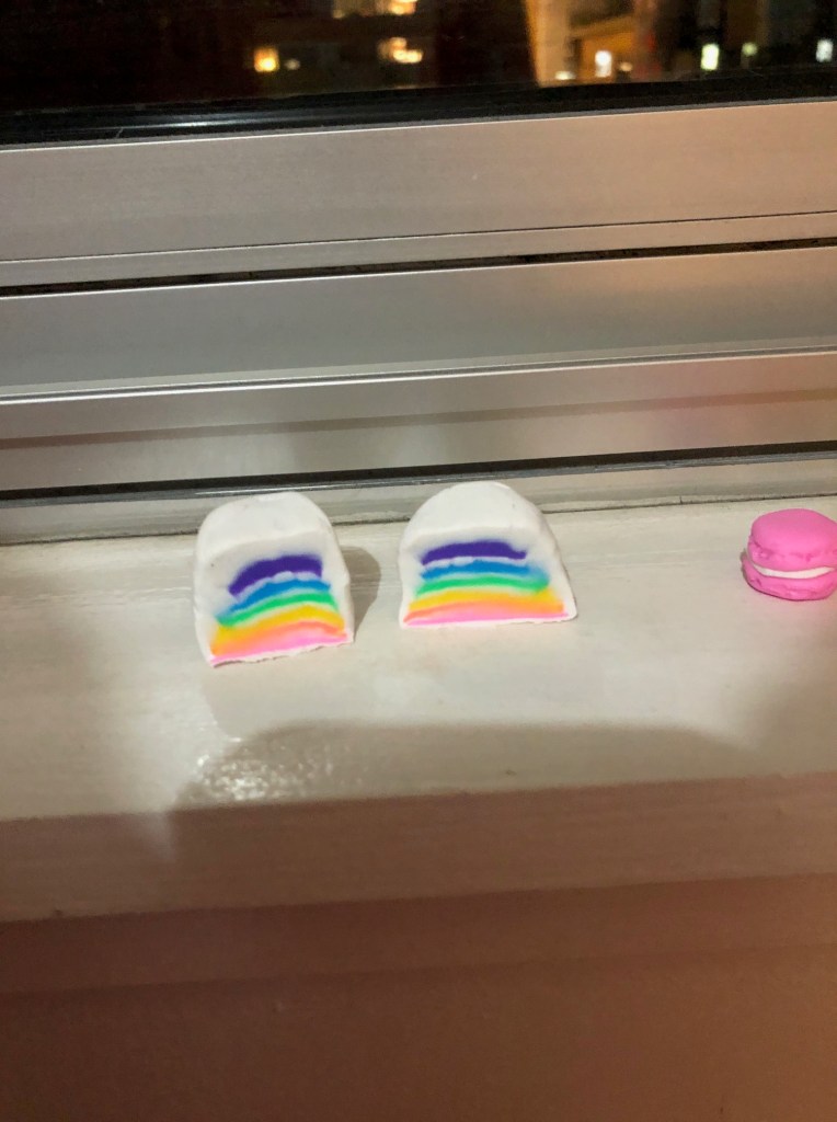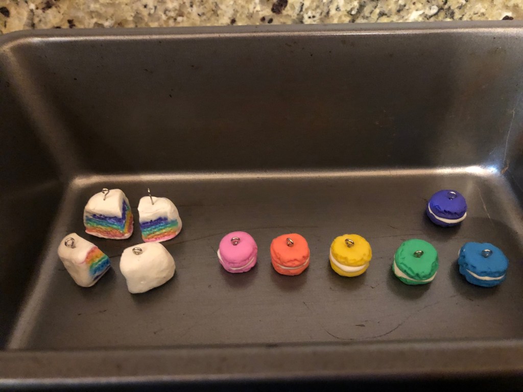 My next project was to make a rainbow cake from which to cut rainbow cake slices. I accomplished this by making discs of all of the colors of the pastel rainbow I used for the macarons as well as white discs that were thinner to represent frosting in between the layers. I covered the entire cake in white clay to represent frosting and then cut the cake into four slices with a knife. After cutting the cake I used a needle to make swirls in the cake layers to give it a sponge-cake like appearance. I put a metal loop in each cake slice to use for an attachment to either earrings or a necklace. I baked the cake slices along with the macarons at 325F for 15 min.