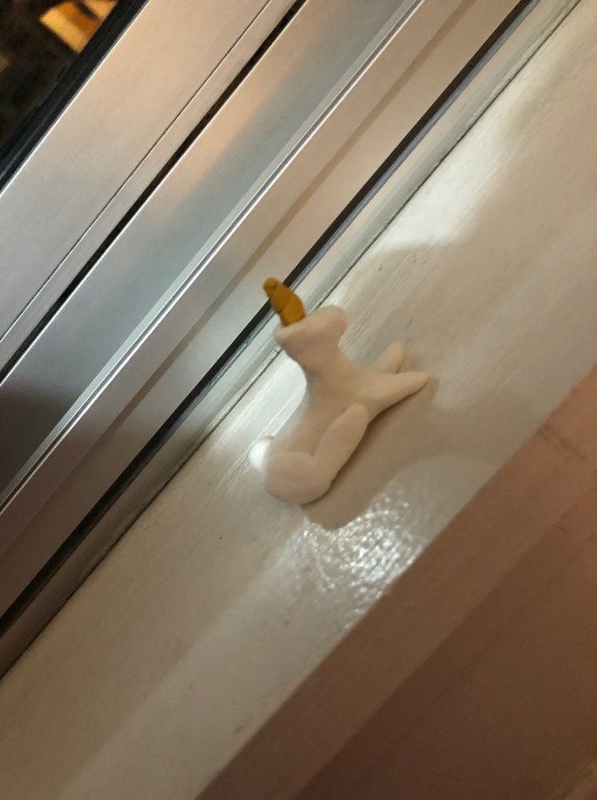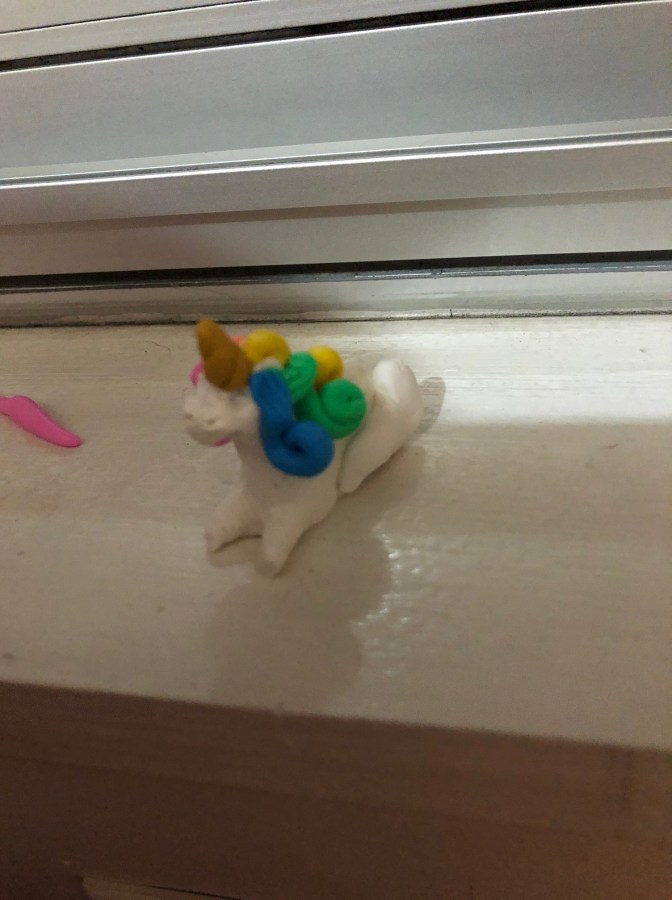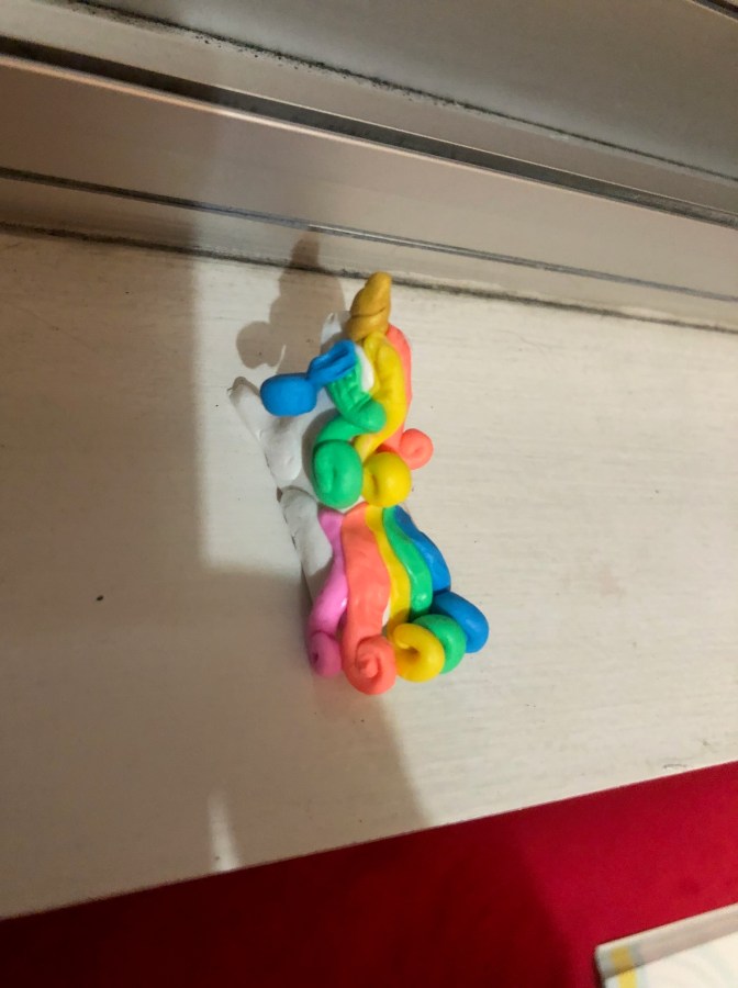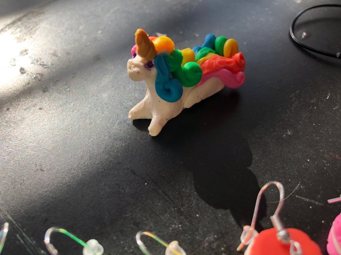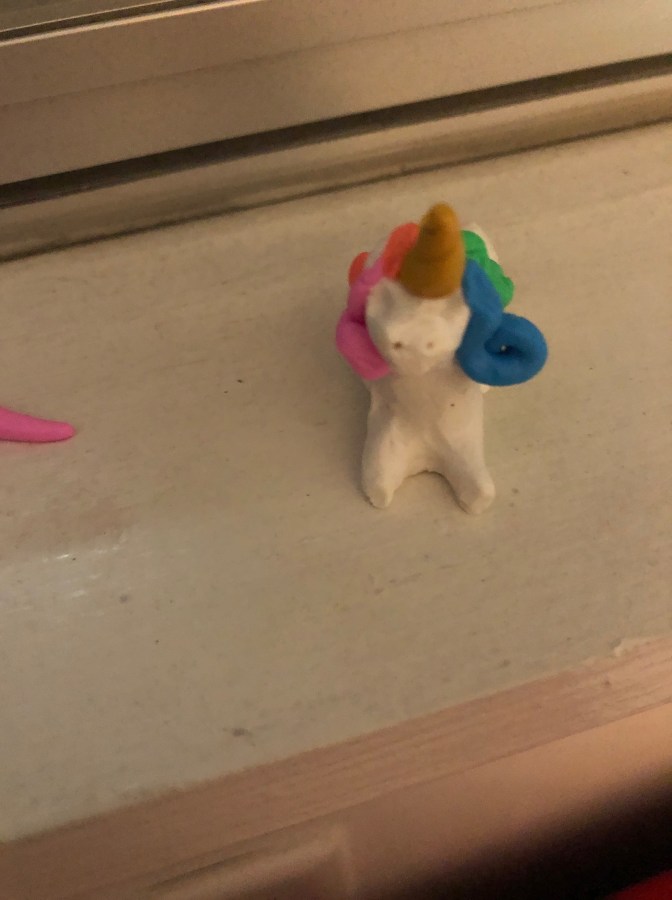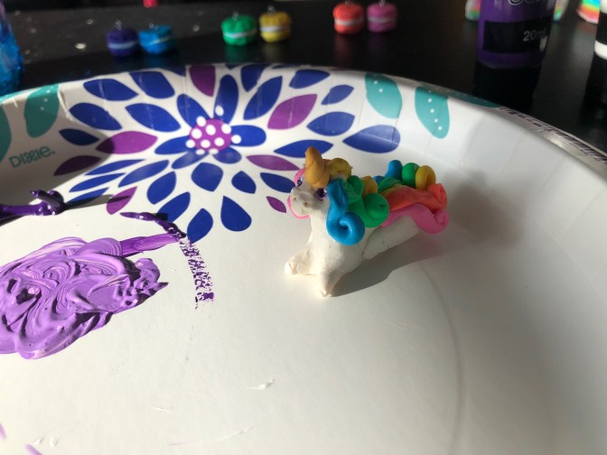 Next I decided to try making a rainbow unicorn. I started by sculpting the unicorn’s body from white clay, first differentiating its head from its body and then using a pinching motion to make ears. I likewise made its front legs using a pinching motion and made its back legs by rolling pieces of clay and attaching them to balls of clay to represent the unicorn’s thighs and legs. I made the golden horn by sticking a metal pin into the unicorn for support and then swirling two golden rods of clay around the metal support. After sculpting the horn, I made the unicorn’s rainbow mane and tale by rolling each color of my pastel rainbow into a rod-like shape and curling the rods at the end to give the unicorn luscious locks. I repeated this for all colors of the pastel rainbow and added them to the unicorn’s body by gently pressing down with an including sculpting tool. I again baked at 325F for 15 min to make my final majestic rainbow unicorn figurine. I added detail to the figurine by hand painting its eyes purple.