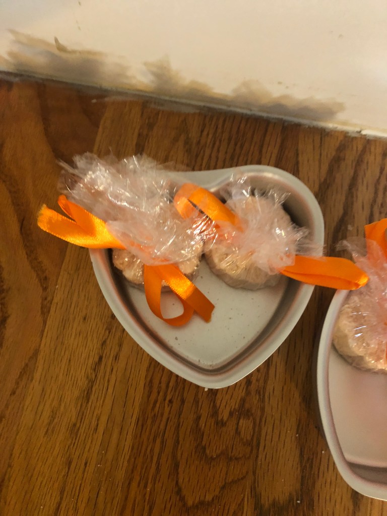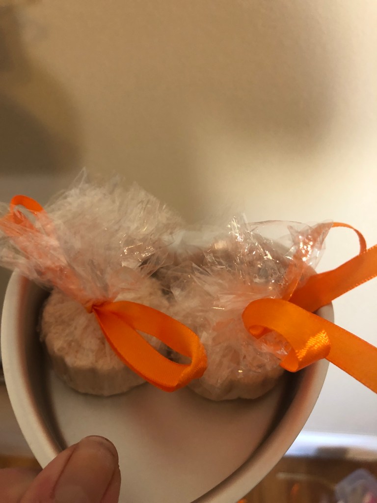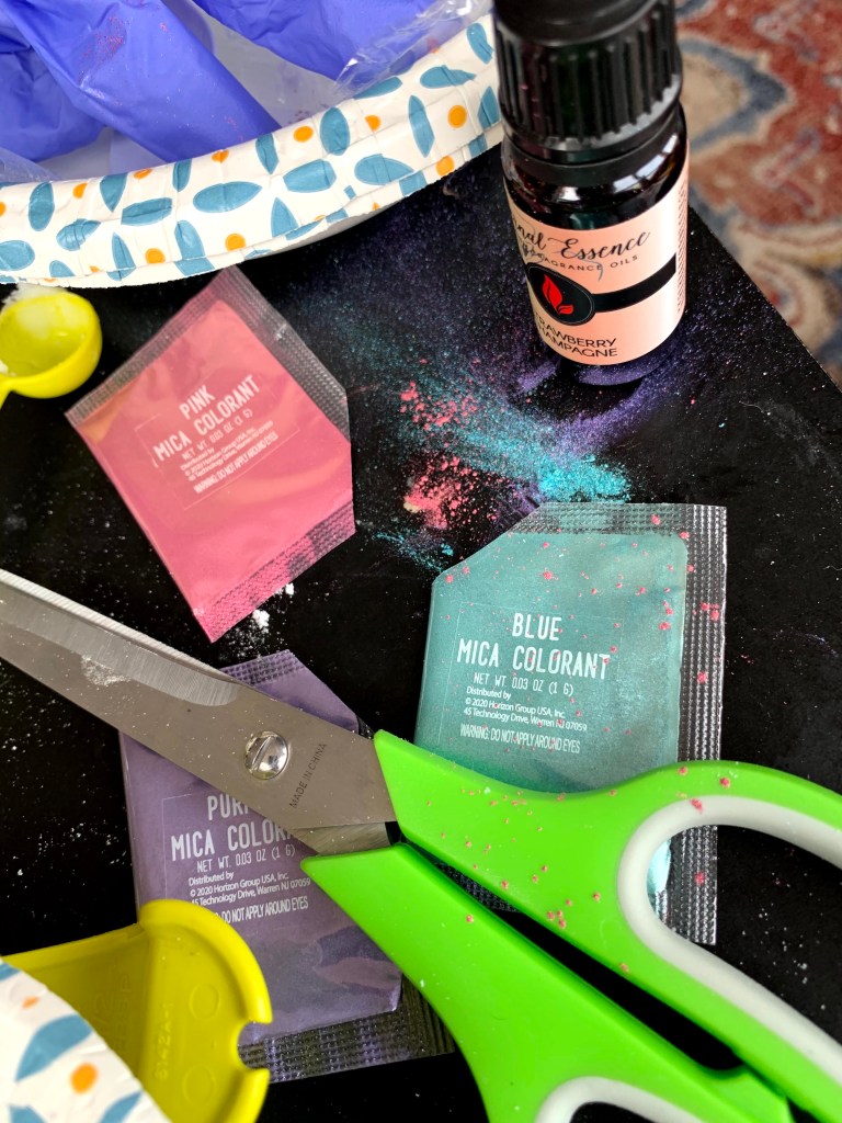 A few of my lessons learned from bath bomb making: wear a mask and gloves and give yourself plenty of space to make a mess! The ingredients are best mixed together by hand but if you don’t want to get dirty and smell like essential oils for days, I strongly recommend gloves like these nitrile gloves I got on Amazon (as a chemist, I always wear nitrile gloves in the lab for both my safety and to prevent continuation so this is a familiar protocol to me). When making bath bombs, you are working with particulate which can easily be inhaled, which is why I recommend a mask so you can breathe easy while working with dusty material. I also recommend using plastic wrap in bath bomb molds (or with the mooncake press) to keep the bath bomb intact and help remove it from the mold. I like dressing up the bath bomb with a fun ribbon.
