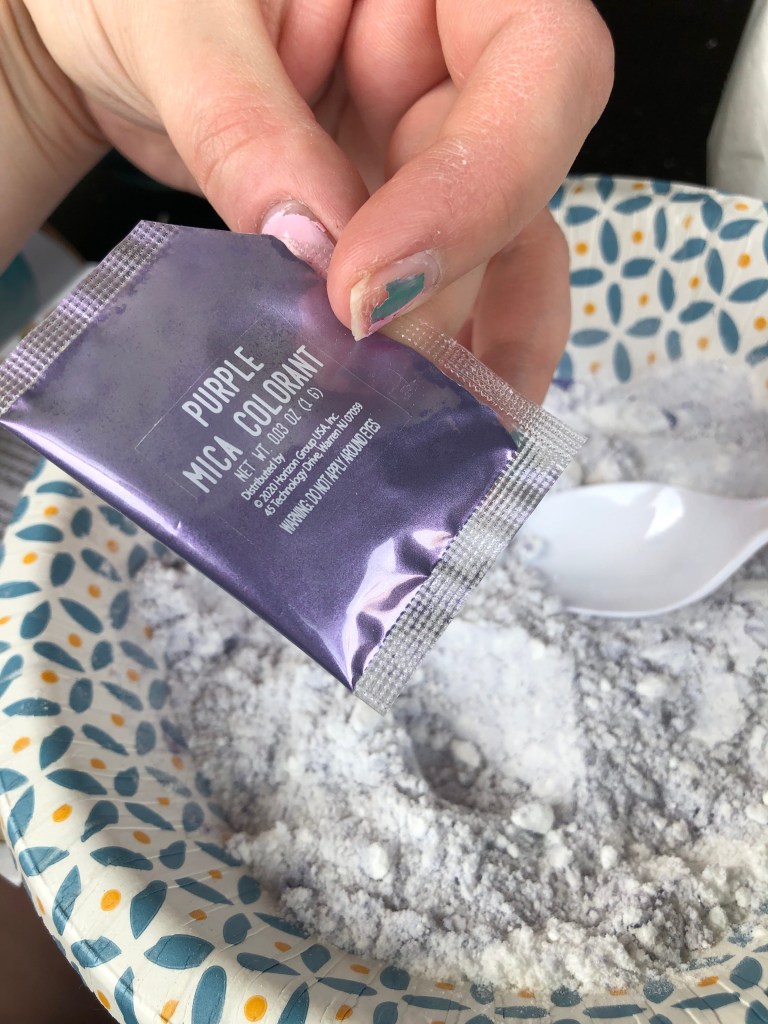 The basic idea is to combine your dry ingredients, add your wet ingredients, and add your personalized colors and scents. For my bath bombs I started with a purple and white swirl to make a lavender vanilla bath bomb. I then went on to make a lavender and strawberry champagne bath bomb, a fruity rainbow bath bomb, and pumpkin spice scented mooncake bath bombs. For molds, I used metal tin spheres and a mooncake press (all advertised on Amazon as bath bomb molds).
