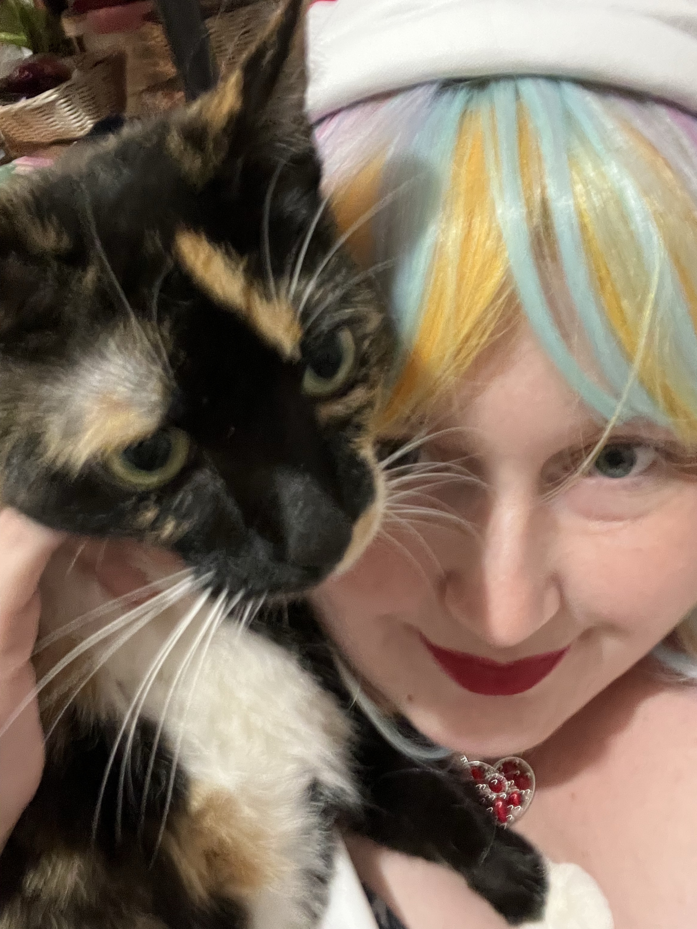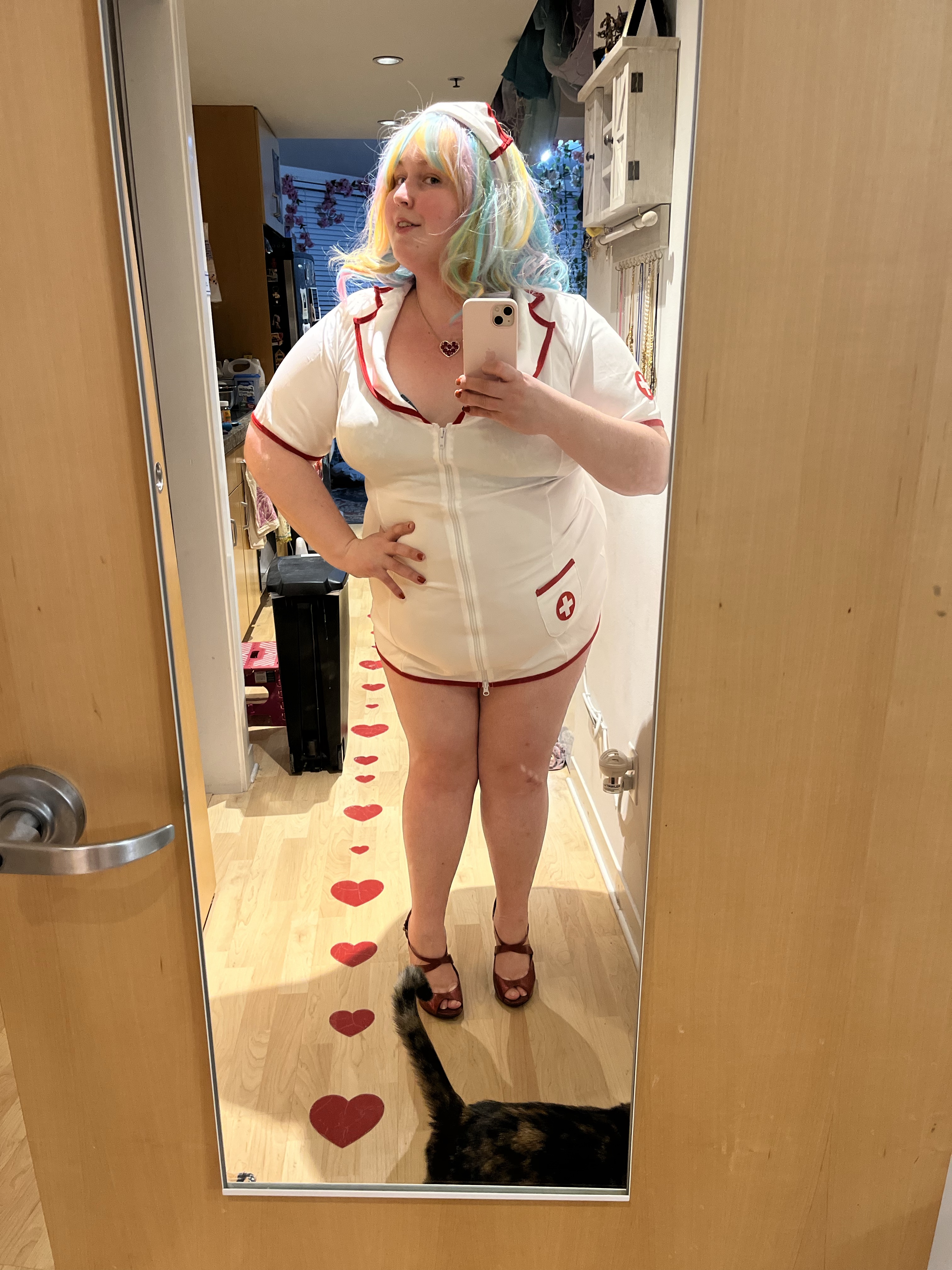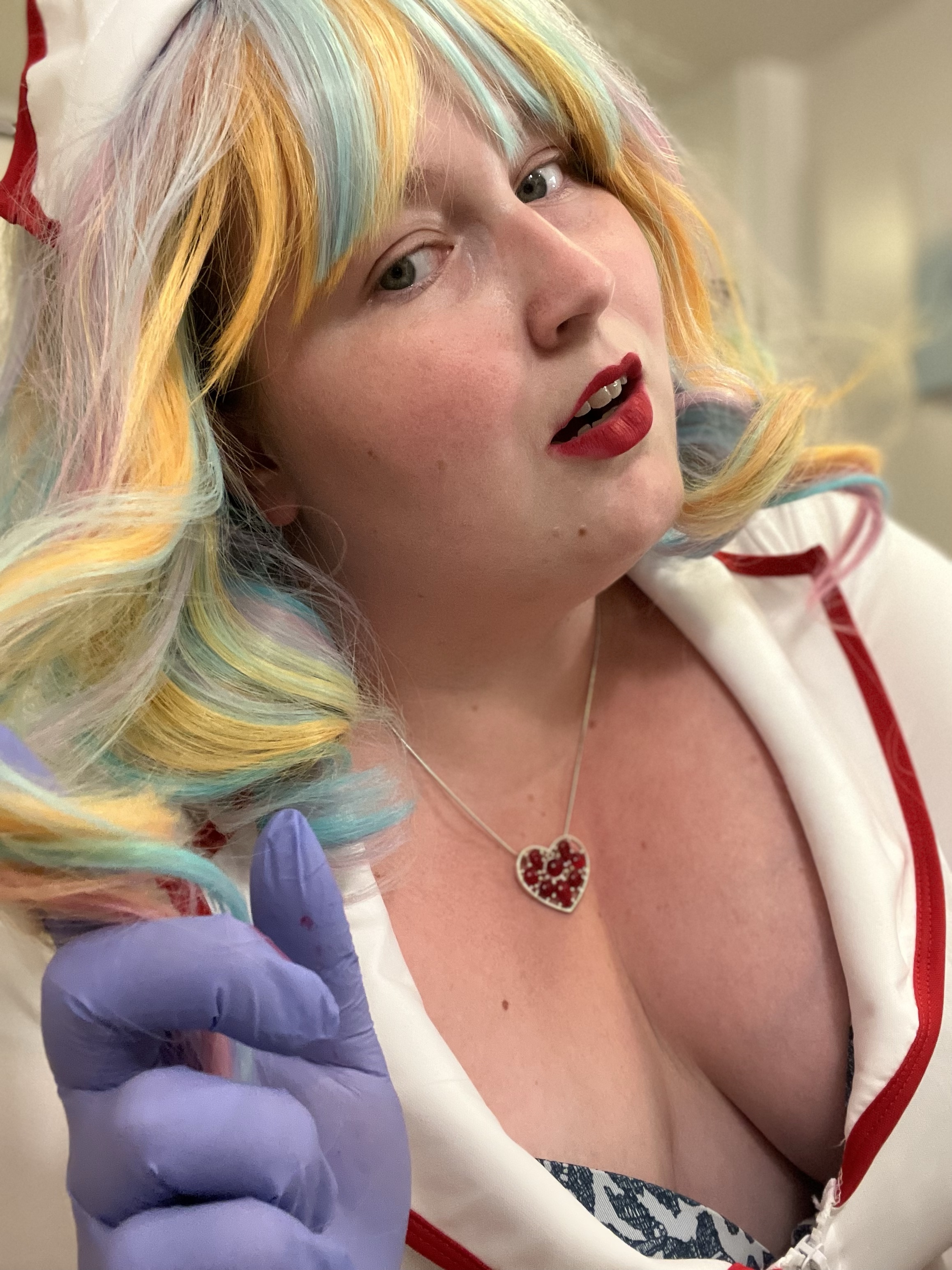 Friday was a quiet night in watching a horror movie with my partner so I surprised him with my sexiest ensemble of the weekend: a Promising Young Woman costume featuring a stripper version of a nurse’s outfit and a rainbow wig. He was so surprised and impressed with the costume that he thought I’d actually dyed my hair (which, to be fair, is totally something I would do). My Halloween (and whenever) life pro-tip for fellow modestly chested women like myself: push-up bras and casually squeezing your cleavage together by hugging yourself. Because what are costumes without a little false advertising? I did this trick (or treat) in my selfies above and used poses (like twirling my hair) to make it look very casual and nonchalant while emphasizing my enhanced cleavage.