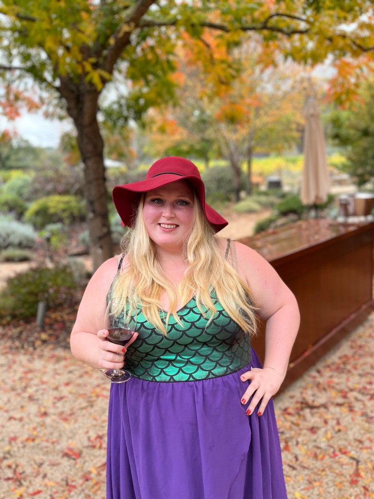 I ended the weekend with wine tasting in Napa where I wore a mermaid dress paired with a fun wine-colored hat. Cheers to a beautiful weekend of costumes and fully vaccinated fun and merriment! 🎃