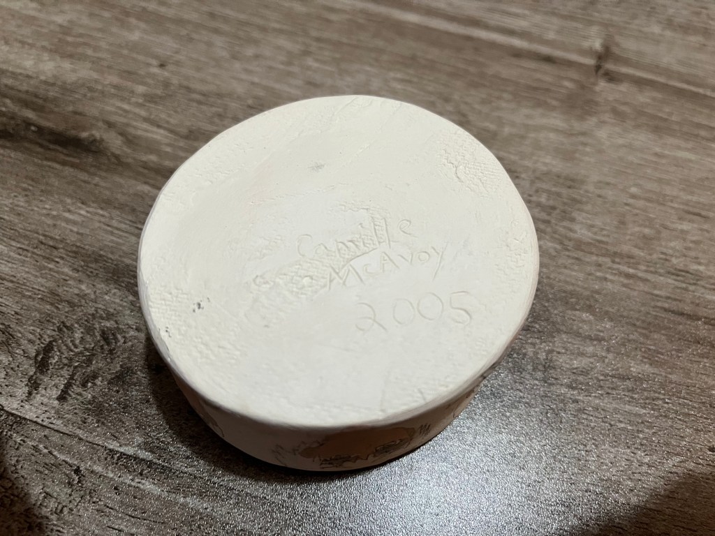 This particular craft is a labor of love that spans over 15 years. While I was home for the holidays recently I came upon a small bowl I had made in a pottery class I had taken over a summer in high school (circa 2015). I had envisioned this piece as a tiny bowl for condiments accompanying an afternoon tea (like clotted cream, jam, or lemon curd) but now it is simply a work of art that I admire on my shelf along with my other crafts. High school Camille had sketched all the characters and painted flesh-tones on them; she had further fully painted the character on the interior of the cup whereas the others remained unfinished. The original piece, inscribed with my name and date of creation, looked as follows.