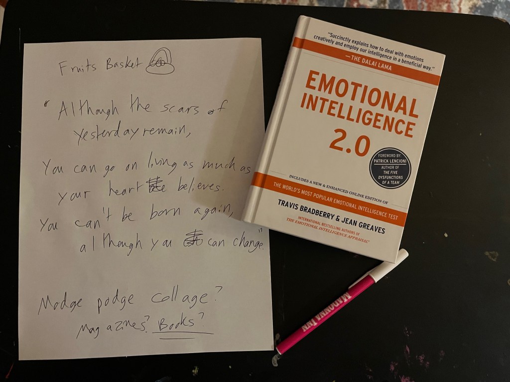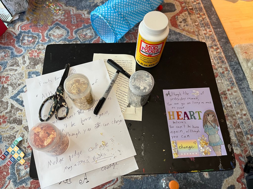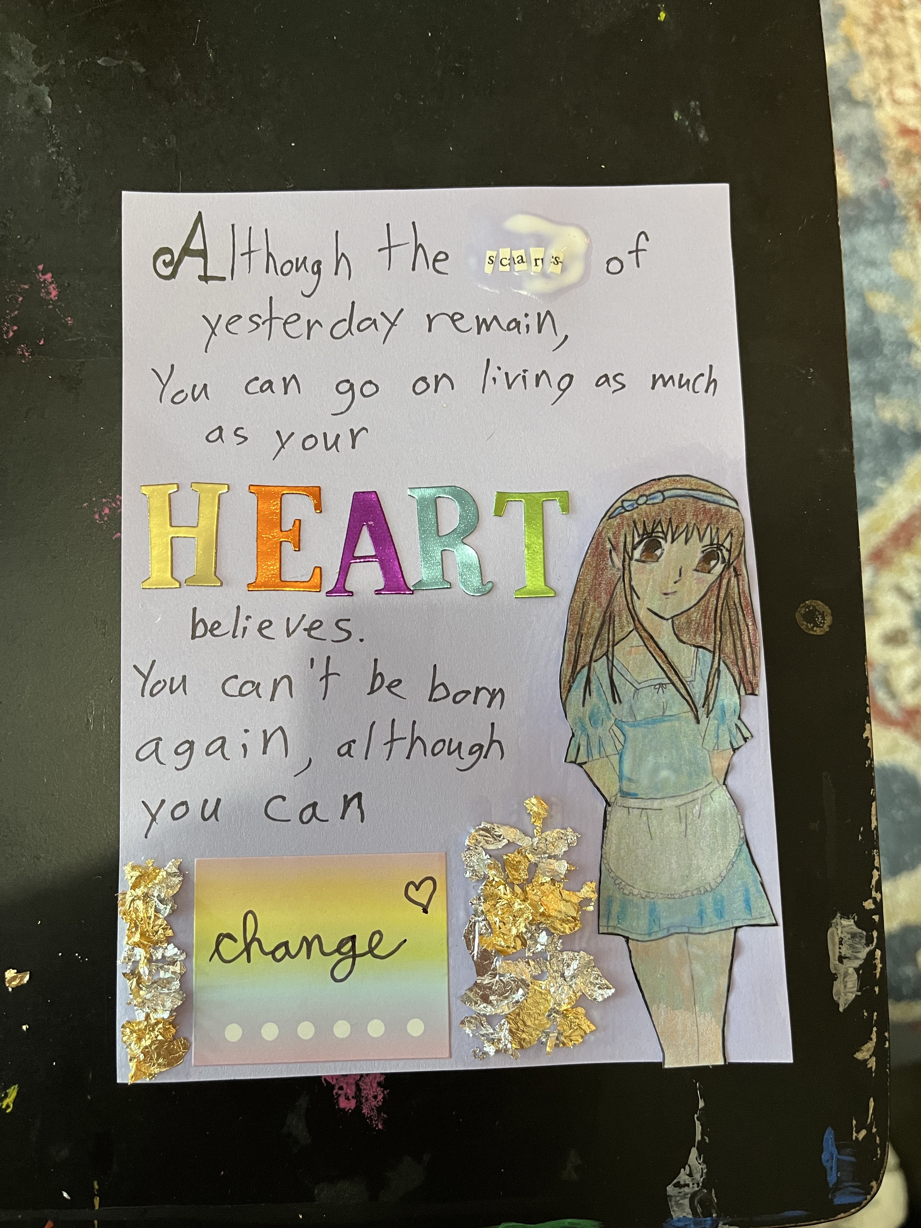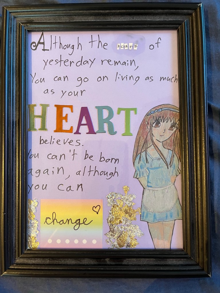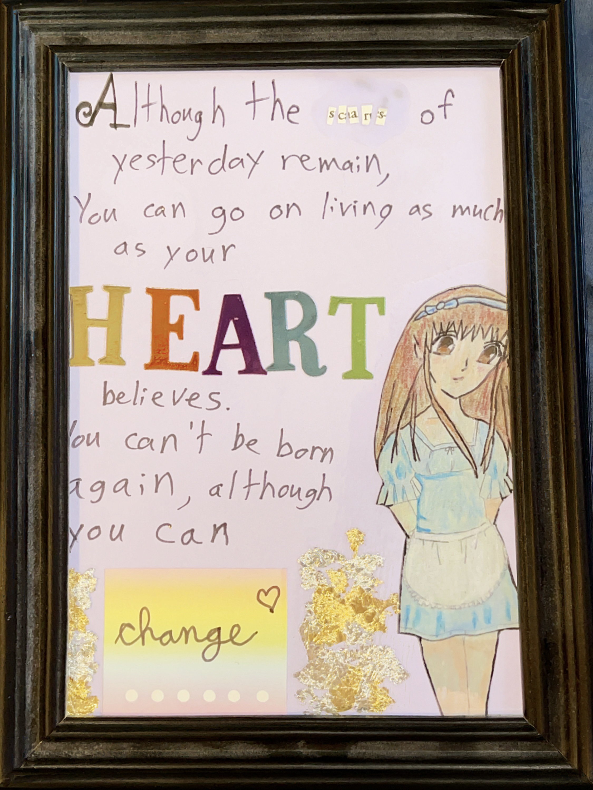 The sketch of Tohru Honda in the lower right corner was drawn by me about 15 years ago when I was in high school. I scanned the sketch from my old sketch book, printed it, and colored it using prismacolor pencils. I then cut out the word “scars” from the book “Emotional Intelligence.” If you look closely there is a remnant of an “e” before the final “s” meaning the mosaic word can be read as scars or scares (or both). I used a calligraphy pen to write the text and stickers to spell out “HEART” and provide the background for the word “change.” I used mod podge to affix the cutout book letters, the drawing of Tohru, and the gold and silver leaf to the card stock background and allowed the piece to set/dry. Below is the final version when it was freshly wet vs framed.