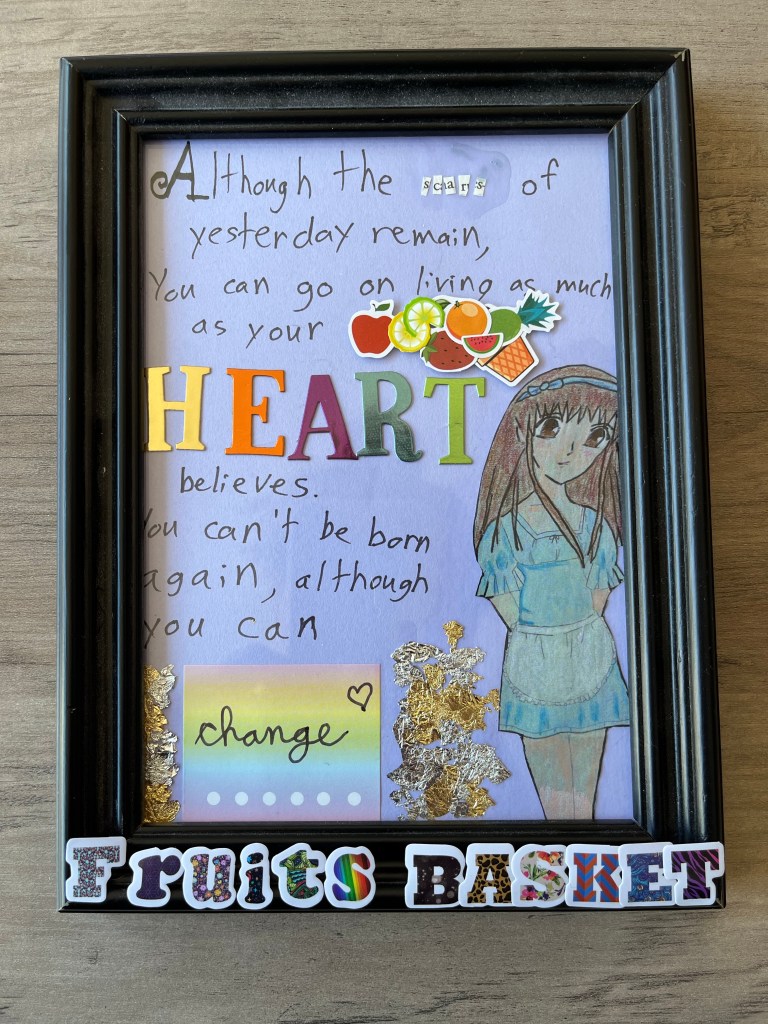 One of the hardest parts of art for me is deciding when a piece is completely done. Before hanging this piece I decided to add some final sticker details to the frame and glass: “Fruits Basket” (the name of the anime/manga from which the quote originates) and a literal basket of fruit composed of colorful stickers.
