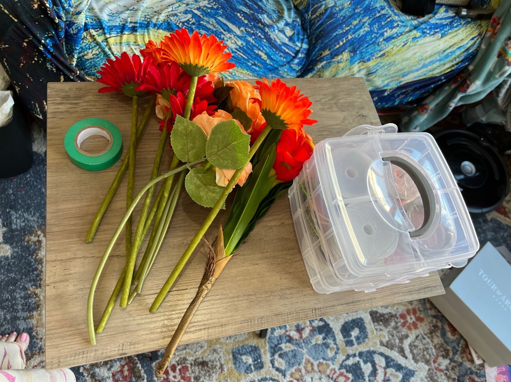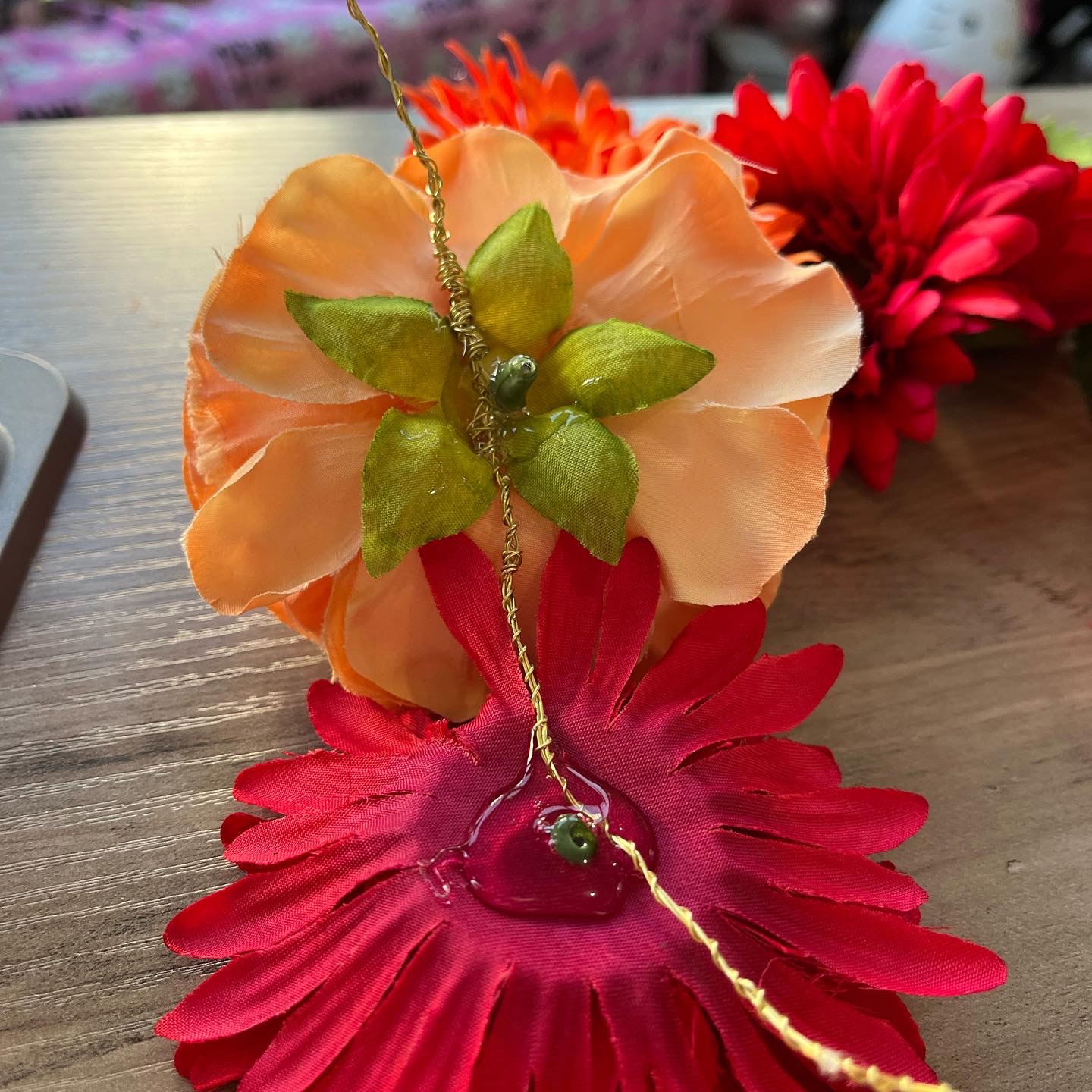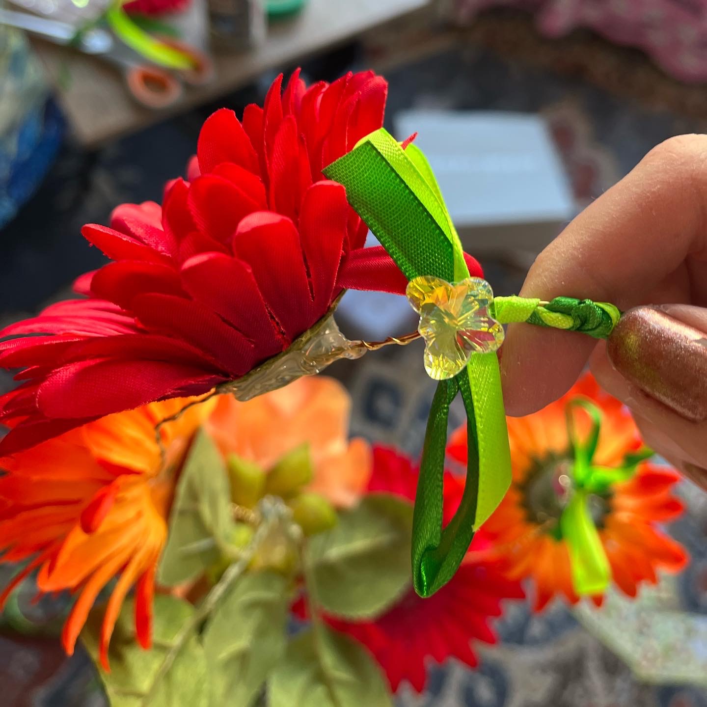 I dismantled the flowers by taking of the outer sheath from the stem and cutting at the bottom of the stem with jewelry cutters (which cut through metal a lot better than scissors). I did it this way because if I had simply plucked the flowers off the top, they would have fallen apart because they wouldn’t have had the central stick to hold their structure together. I attached the flowers to the crown using a hot glue gun. Because I am impatient, I used canned air to make the hot glue dry faster (I got the idea from watching people use “chilling spray” in baking competition shows). To do this, I allowed the hot glue a little time to set them sprayed with canned air from a distance getting closer to the glue as I confirmed that the air was not moving the glue because it was sufficiently set. I did this for each flower in the crown. I then added leaves from the one of the faux flowers to give an even more crown-like shape. I used diamond, star, and butterfly shaped crystals to give the crown some sparkle. After all the glue had sent, I wrapped the wire in ribbon to both make it beautiful and more comfortable to lay on my head. I used light and green ribbon and twisted it around the wire in a braided fashion, beginning and ending in bows. To make sure the ribbon didn’t come undone, I set the bows with butterfly crystals affixed with hot glue. And voila! Beautiful homemade flower crown 🌺 🌸 🌺
