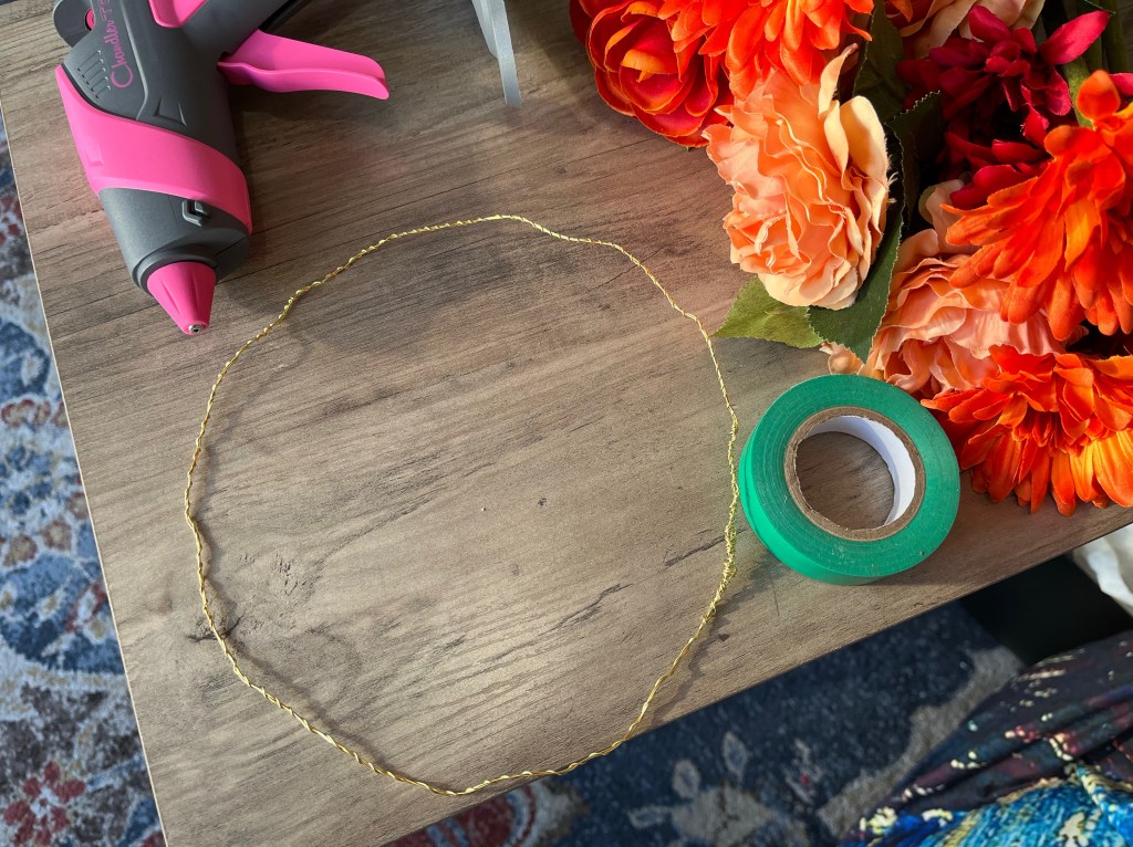 I started my flower crown by measuring my head with jewelry wire and using enough wire to wrap around my head three or four times. In retrospect, I should have made it slightly bigger than my actual head because I didn’t account that the hot glue/flower backings would slightly decrease the circumference of the headband but the crown still seated well on my head in spite of this. I wrapped the wire around itself loosely for one circumstance or the circle and then tightly with the remaining wire such that the final product was well secure so that it wouldn’t unravel and looked as pictured below.