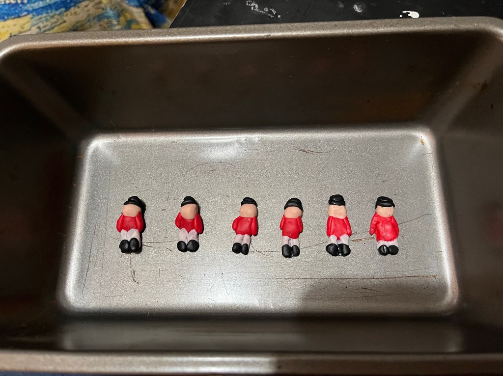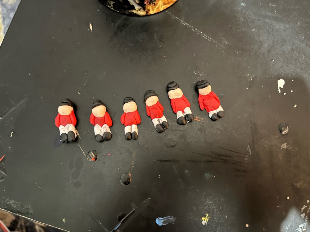 I began by crafting my mini nutcrackers from oven-bake clay. The clay I used and more details about getting started in clay sculpting are described in more detail here. I used varying colors of clay to make their red suits, black hats, etc. before baking the clay to harden it.