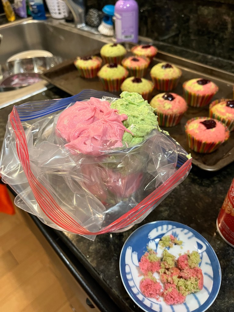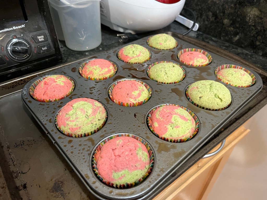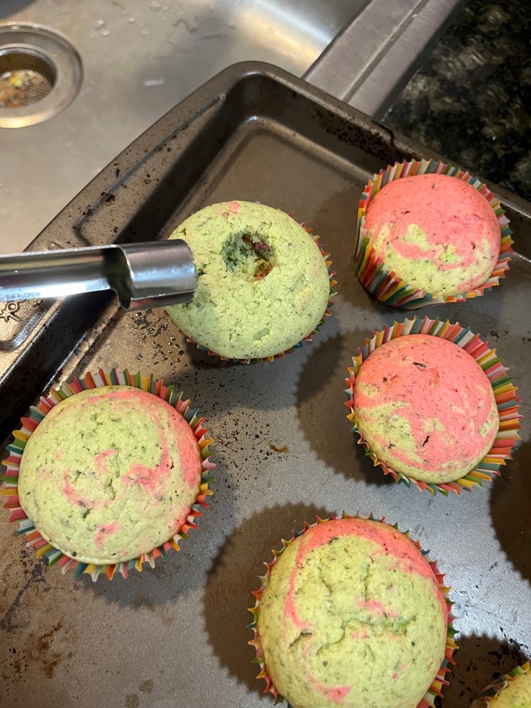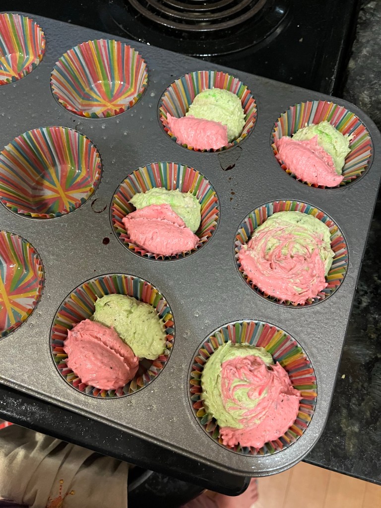 - Using an ice cream scoop fill each cupcake liner to 2/3 full and bake for 20 minutes until risen and springy when touched (I used half pink and half green batter for each cupcake and the swirled them together with a toothpick). Allow to cool in the tin for 5 minutes before removing to a baking rack to finish cooling.