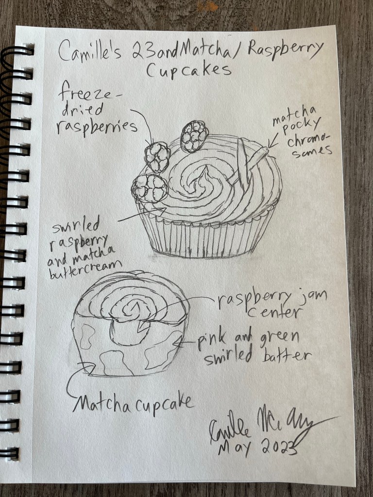 - Once the cupcakes have cooled take an apple corer or a small knife and hollow out the center of each cupcake and fill with raspberry jam. Fill a piping bag, fitted with an open star nozzle, with the half raspberry frosting and half matcha frosting and pipe a cute swirl on each cake. Use the pocky to make 23andMe chromosomes and add three freeze dried raspberries for additional decoration.