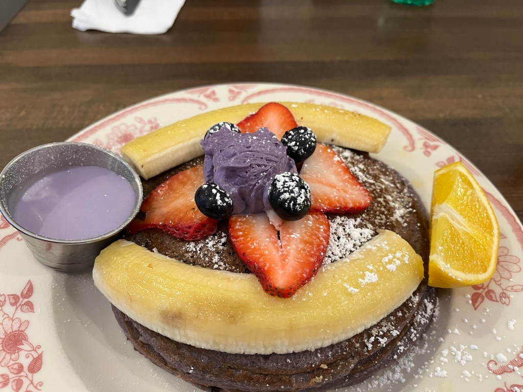 The latte was sweet and milky. It had a mix of a coffee flavor and a red velvet one. The ube pancakes came with ube butter (top) and ube syrup (left). They were sweet, fluffy and had a delicious ube flavor that the ube syrup really enhanced. Overall, we had a great and delicious brunch experience.