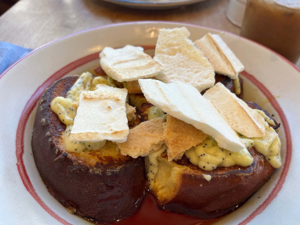 For my entree I got the lemon poppyseed French toast which had layers of French toasted bread soaked in what tasted like a bourbon syrup topped with a lemon poppyseed custard and shortbread as well as meringue. Although this dish generally tasted good it was a little disjointed and did not make for a cohesive brunch experience. The meringue topping was the most delicious component.